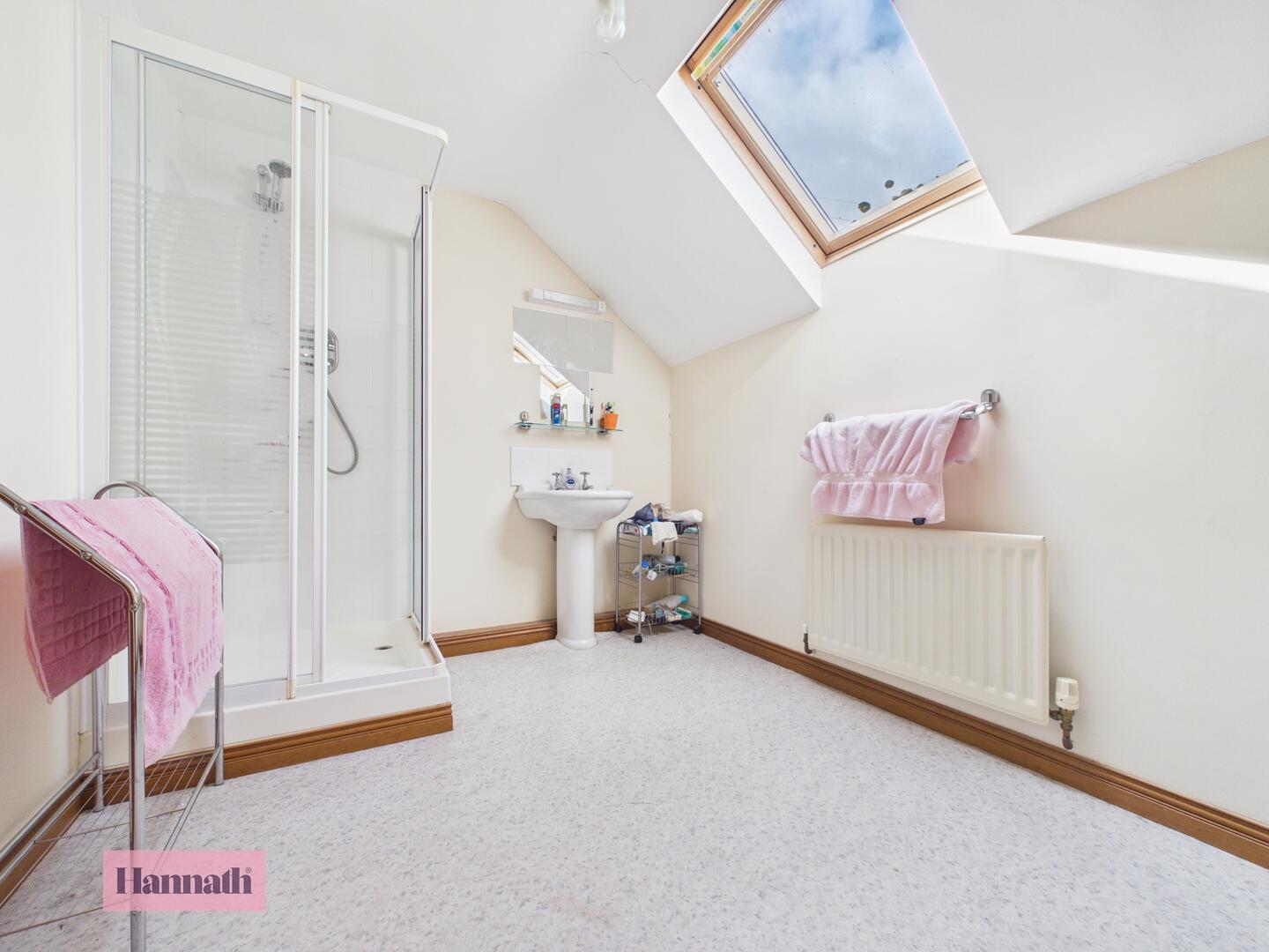 The first floor bathroom is fitted with a shower cubicle, a pedestal sink, and a toilet. It benefits from a skylight window that allows natural light to fill the room, enhancing the fresh and clean atmosphere.
