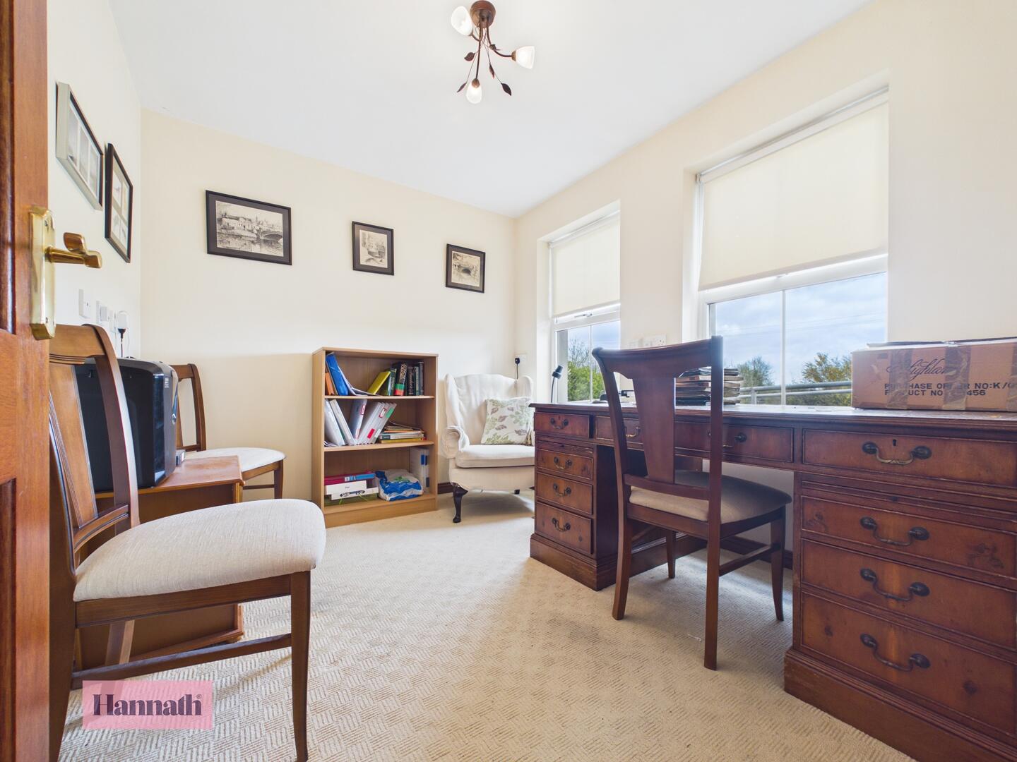 The office is a compact, well-lit space with carpets and windows overlooking the outside, ideal for working quietly from home or as a study.