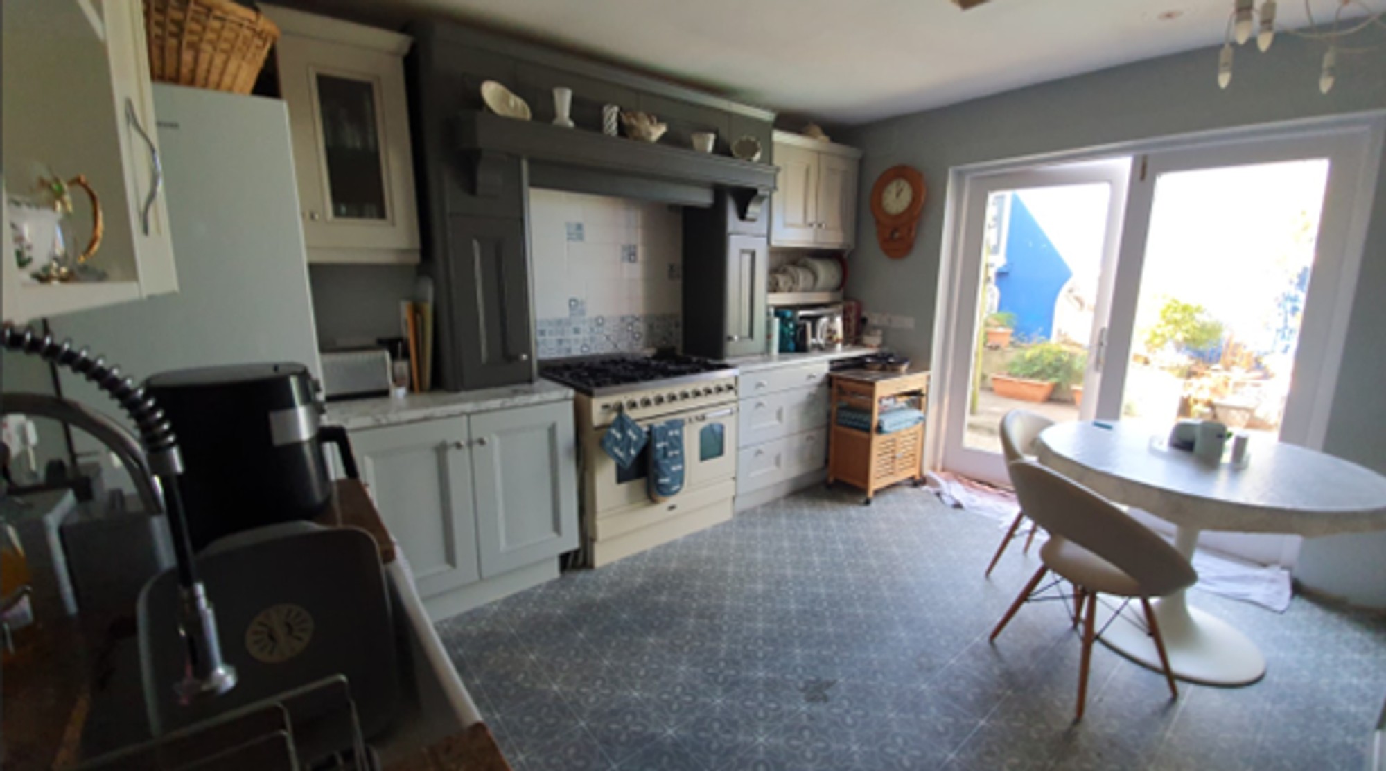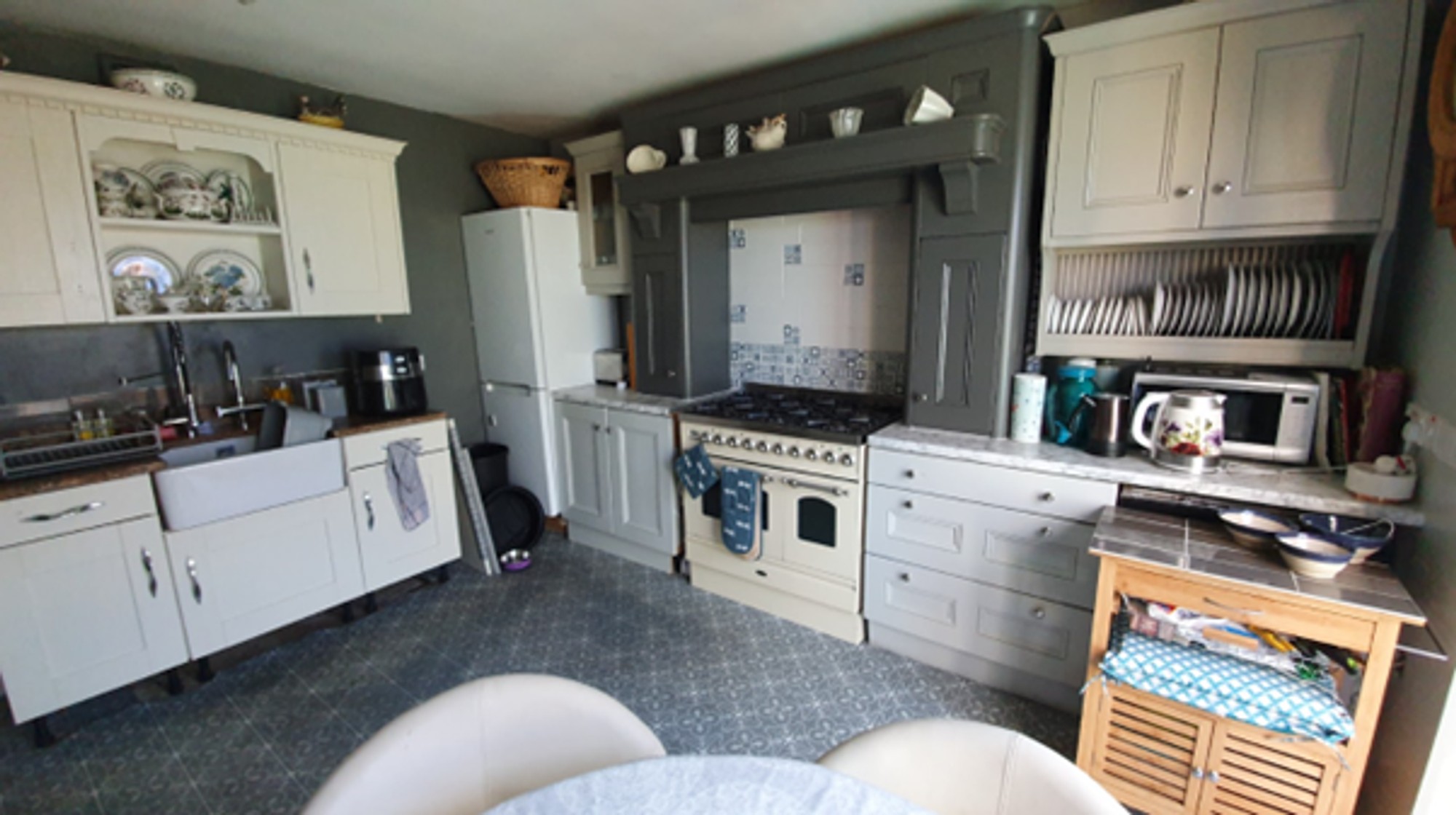 Having a Belfast style sink unit, marble surround worktop, eye and low level units, plate rack, glass display unit, pantry cupboard, french doors to rear yard.