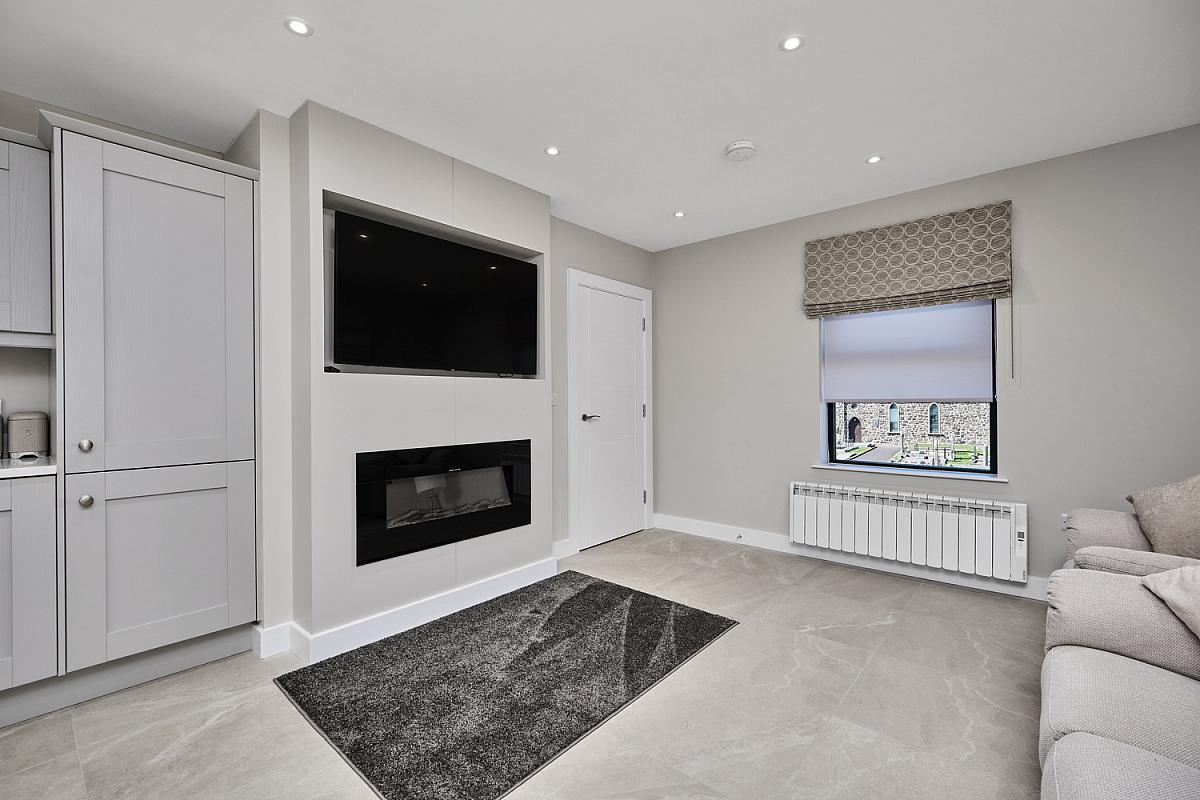 With recess for TV, recess for electric fire, tiled floor and recessed lighting.
