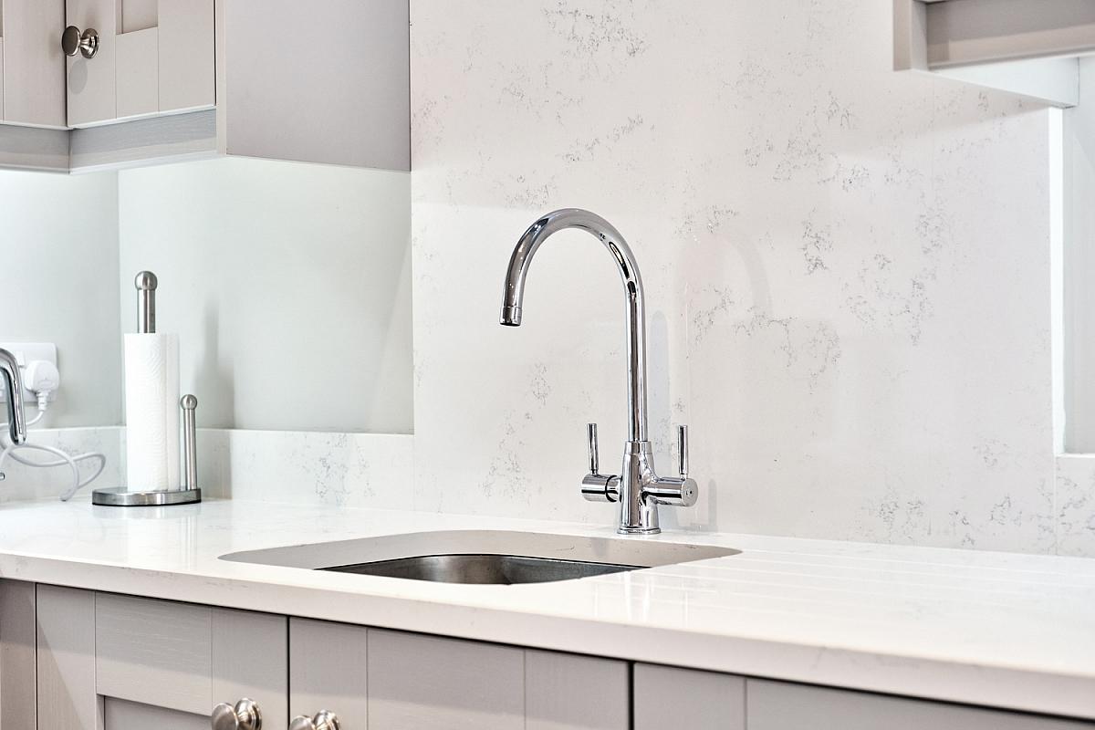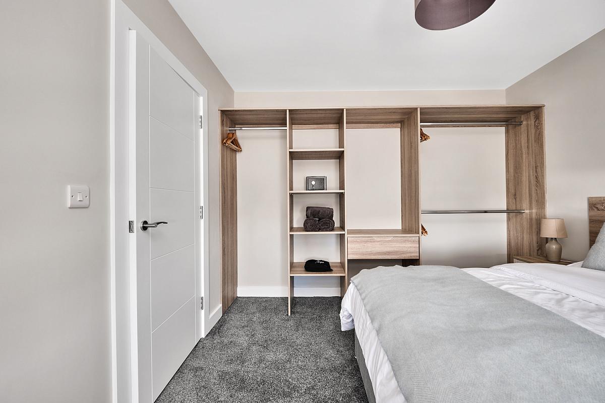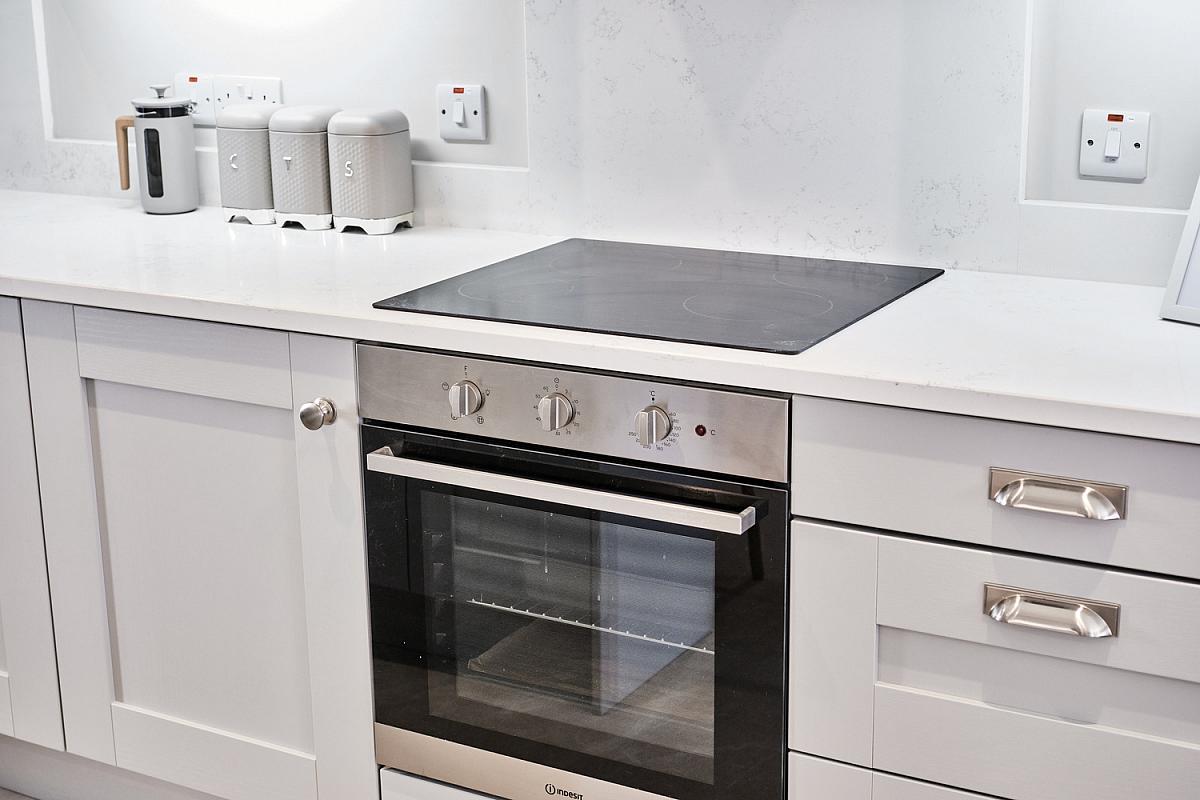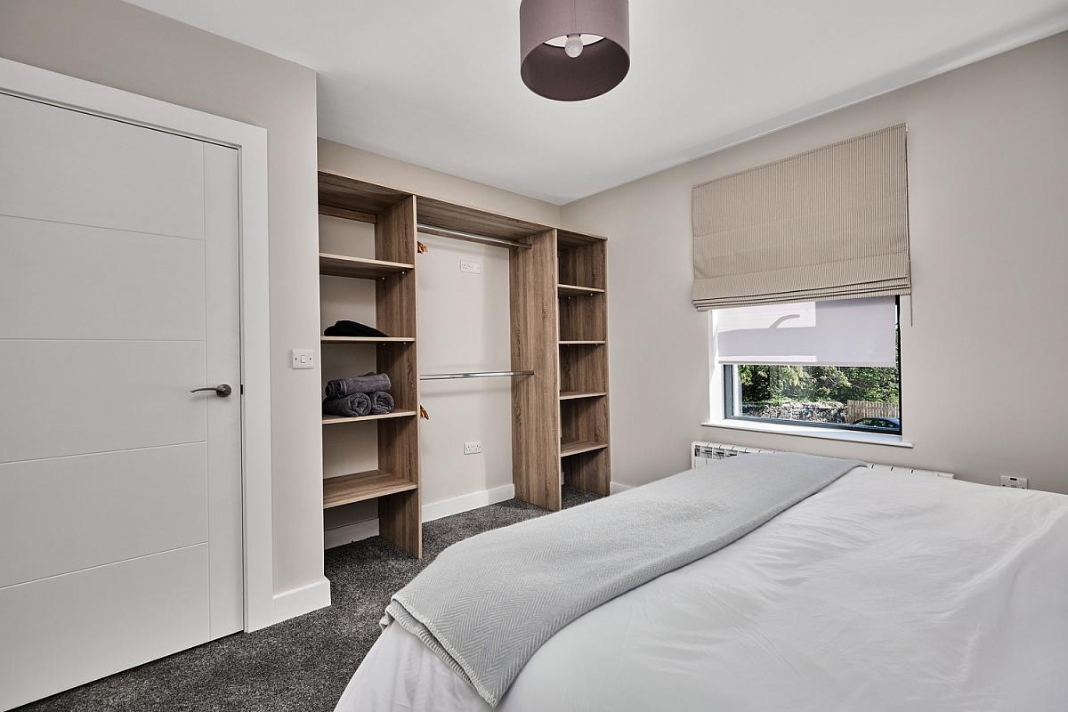 With broom cupboard housing electric heating system, plumbed for automatic washing machine, space for tumble dryer, tiled floor and extractor fan.