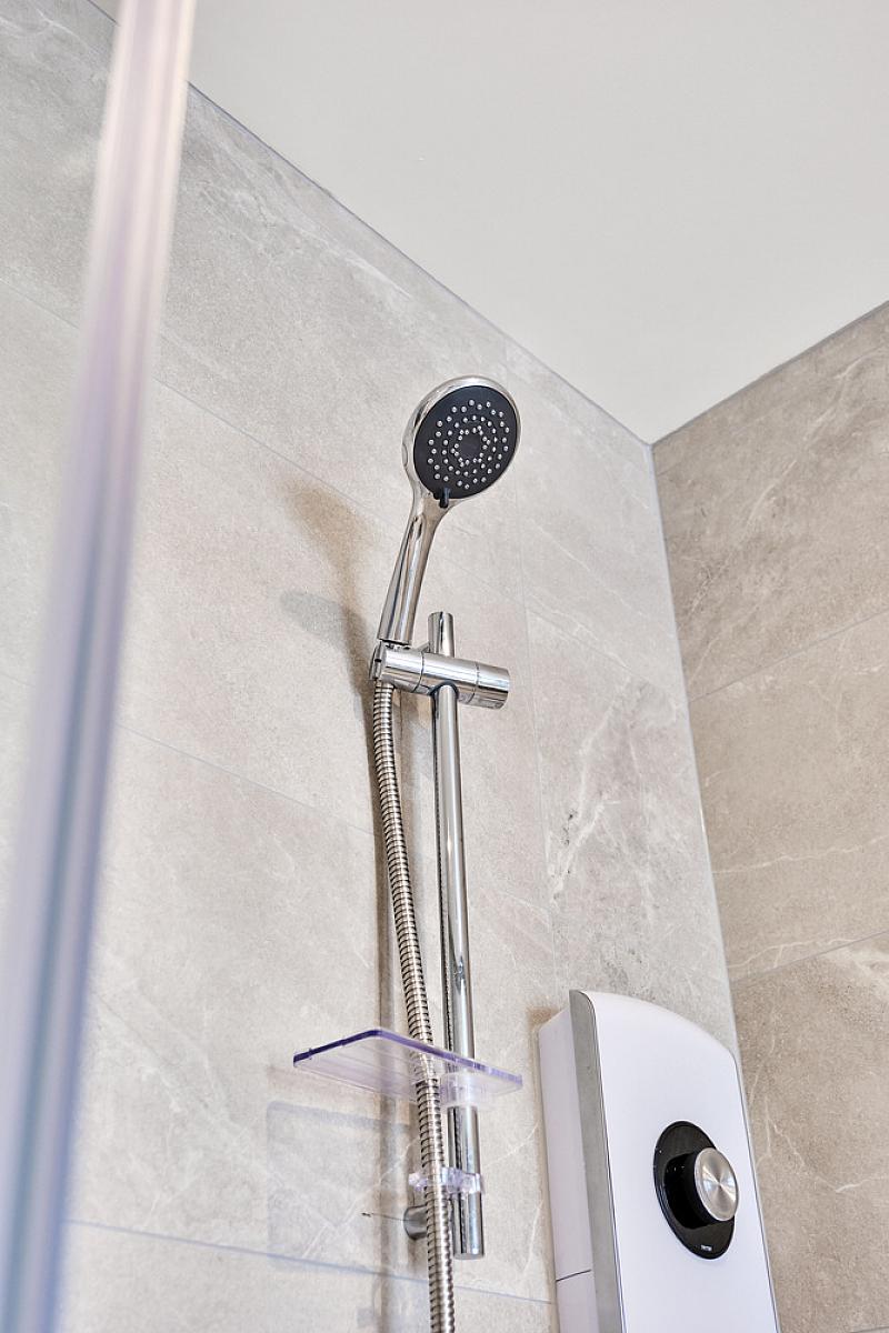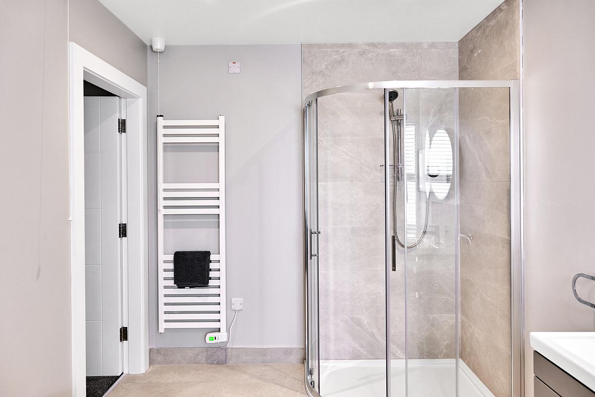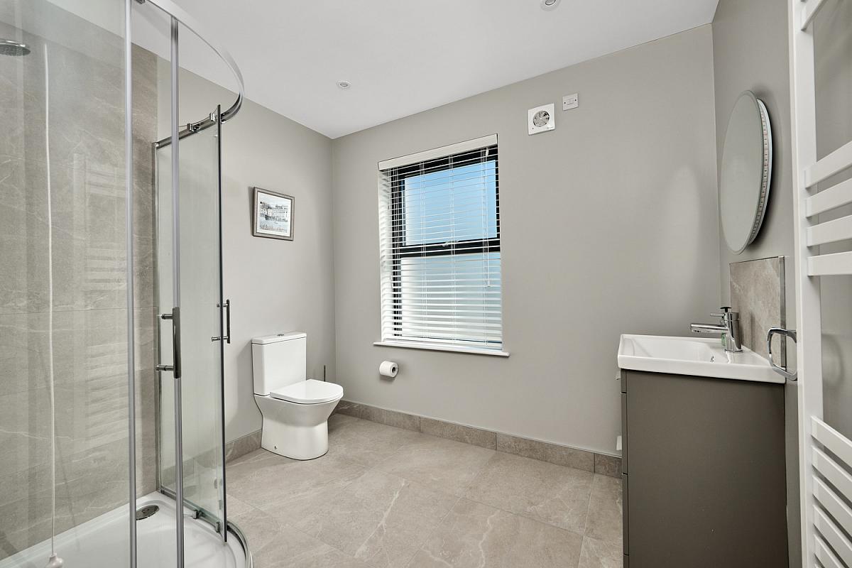With white suite comprising w.c., wash hand basin with storage below and tiled splashback, illuminated mirror, fully tiled walk in shower cubicle with electric shower, heated towel rail, tiled floor, recessed lighting and extractor fan.
