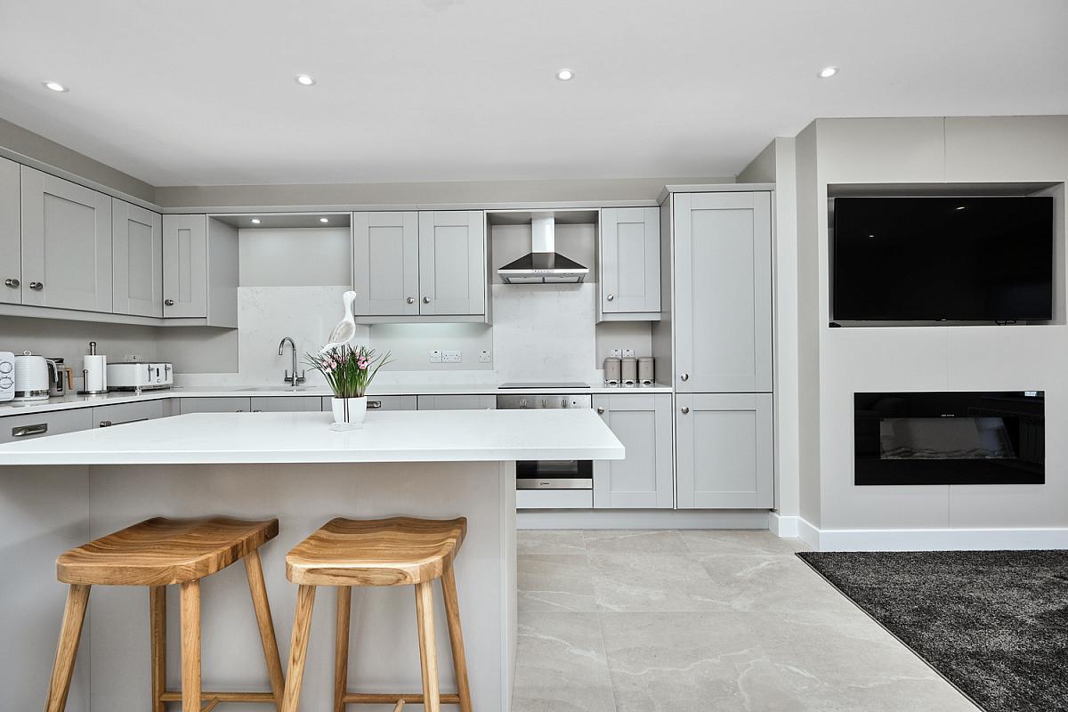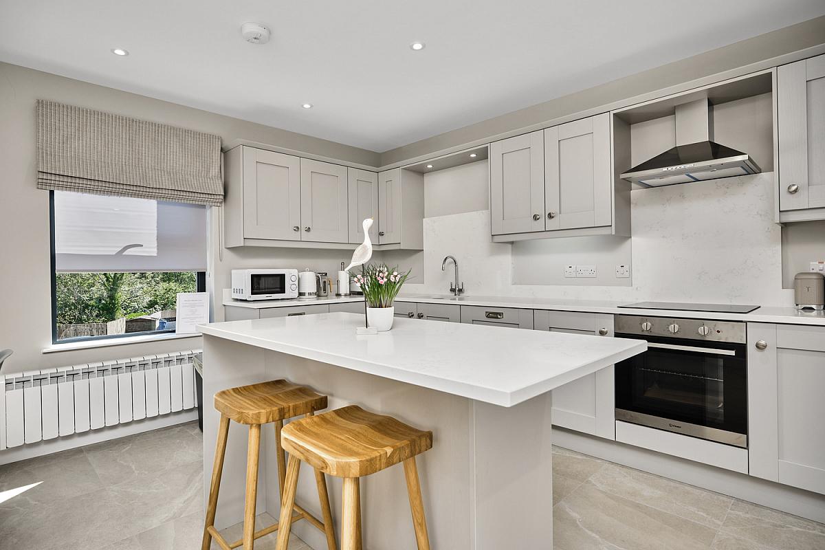 With single drainer stainless steel sink unit, range of high and low level units, Integrated ceramic hob with granite splashback, oven with stainless steel extractor fan above, fridge freezer, dishwasher, saucepan drawers, granite worktops and upstands, island with matching granite worktop and storage below, breakfast bar, integrated corner dining able with bench, tiled floor and recessed lighting.