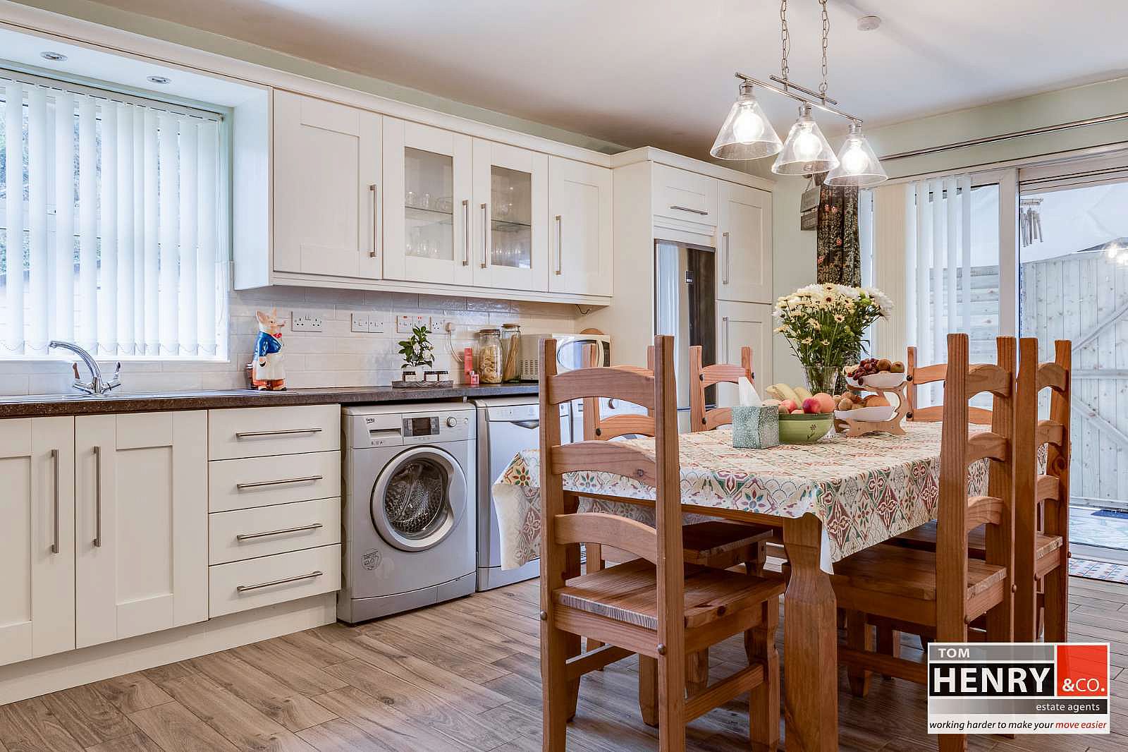 HIGH & LOW LEVEL UNITS. GLAZED DISPLAY UNITS. PELMET WITH DOWNLIGHTING OVER S.S. SINK WITH MIXER TAP FITTING. SPACE FOR COOKER WITH X-FAN OVER. SPACE FOR FRIDGE FREEZER. PLUMBED FOR WASHING MACHINE & DISHWASHER. SPACE FOR TUMBLE DRYER. TILED BETWEEN UNITS. UNDER STAIR STORAGE. TILED FLOOR. GLAZED PATIO DOORS TO EXTERNAL DECKED AREA / LEAN-TO / GARDEN ROOM.