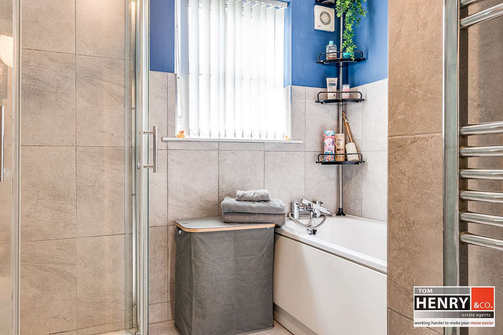 FULLY TILED SHOWER. WASH HAND BASIN WITH MIXER TAP FITTING IN VANITY UNIT. BATH WITH MIXER TAP SHOWER HEAD FITTING. TOILET. HEATED TOWEL RAIL. PART TILED WALLS. TILED FLOOR. X-FAN.