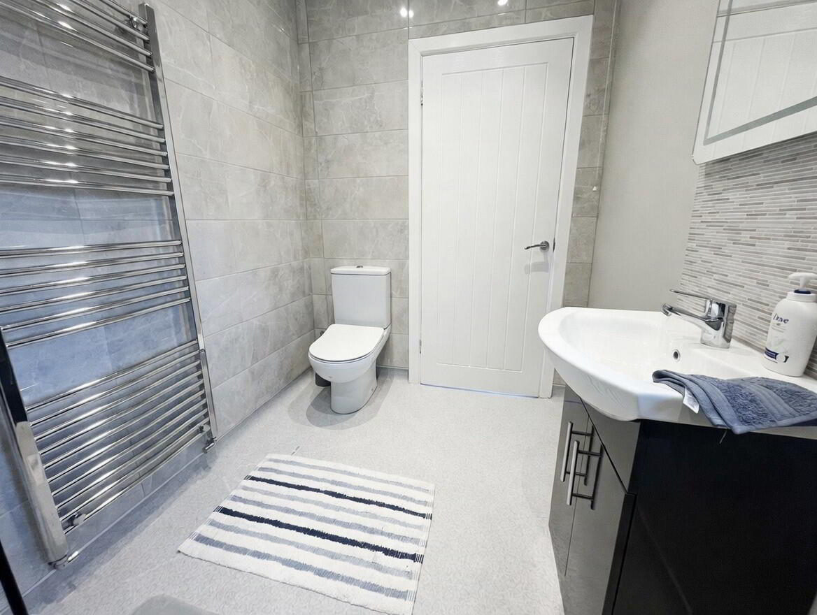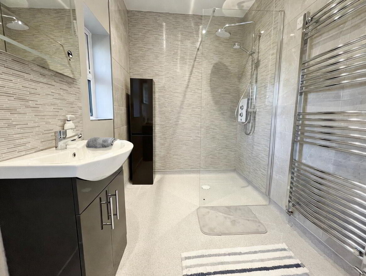 Shower Room: 9'0" x 5'9" shower enclosure with framless glass, electric shower with drencher head and hand held attachment, fully tiled walls, chrome heated towel rail, tiled floor, whb with vanity unit.