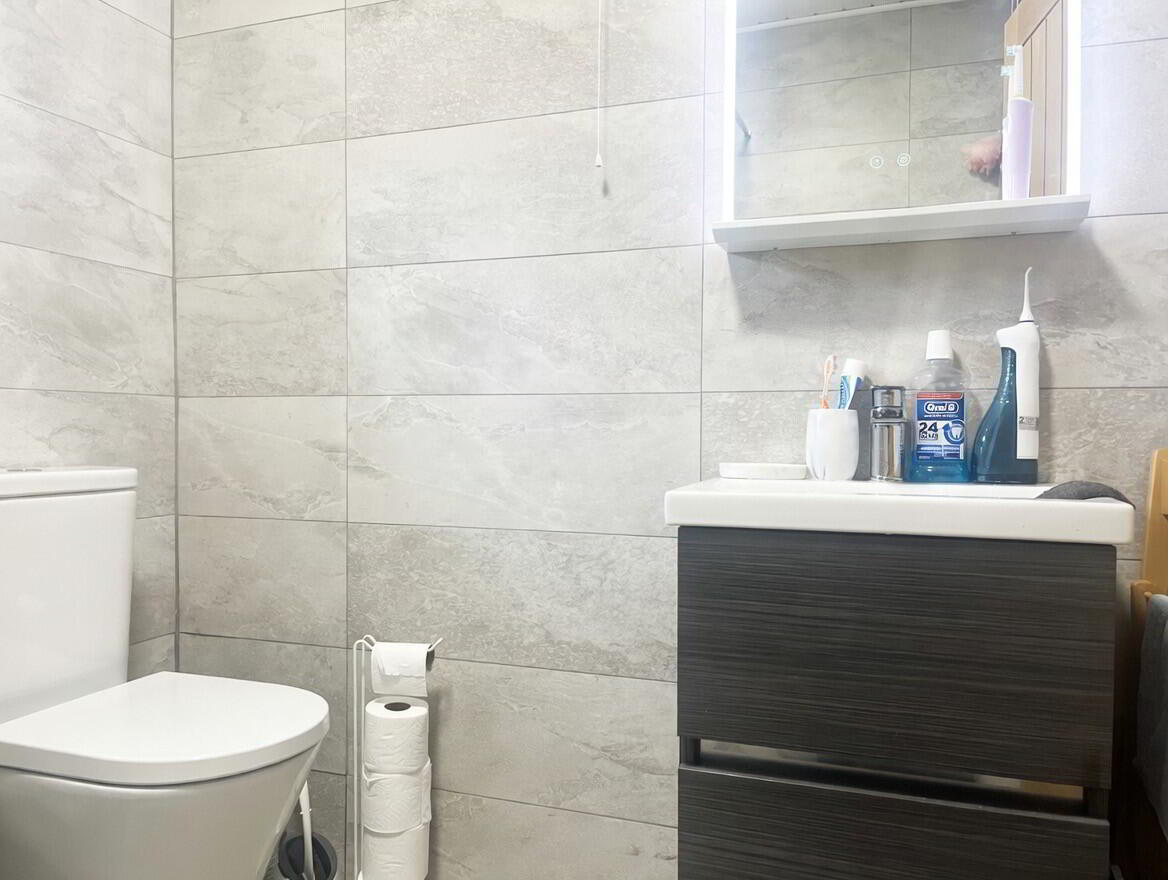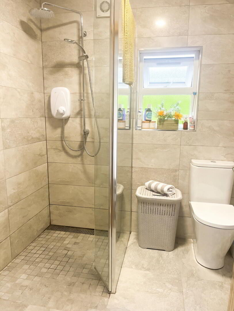 Side Hallway - with cushioned flooring, Wet room comprising - full tiled walk in electric shower cubicle with drencher head and hand held attachment, glass shower screen, WC, wash hand basin with vanity, touch light mirror over, tiled floor, tiled walls, chrome heated towel rail, PVC panelled ceiling.