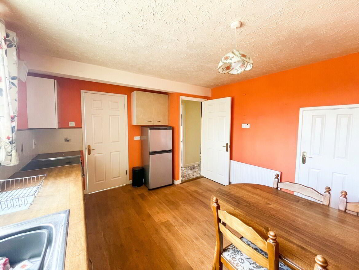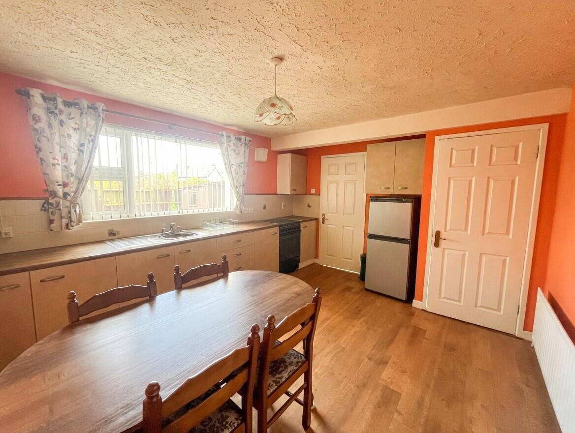 Kitchen/Dining - 13'11" x 11'3" Fitted with a range of eye and low level units, tiled around worktops, stainless steel sink unit, space for electric hob and oven, cushion flooring, hotpress, built in storage.