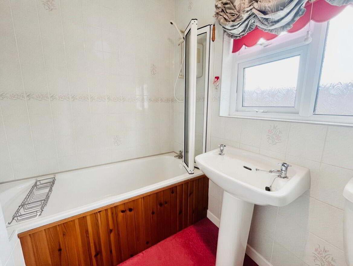 Bathroom - wood panelled bath with electric shower over, WC, wash hand basin, fully tiled walls.