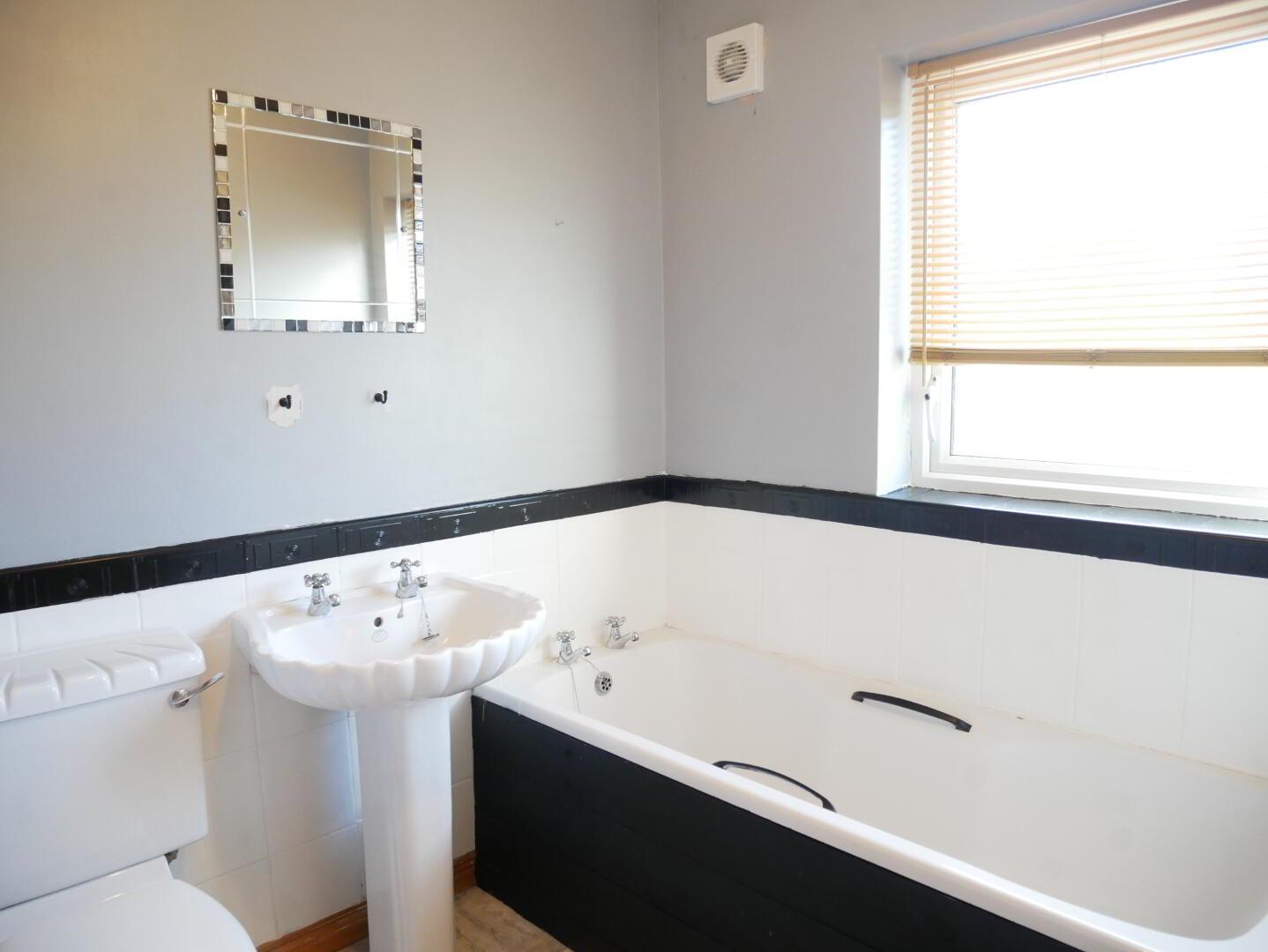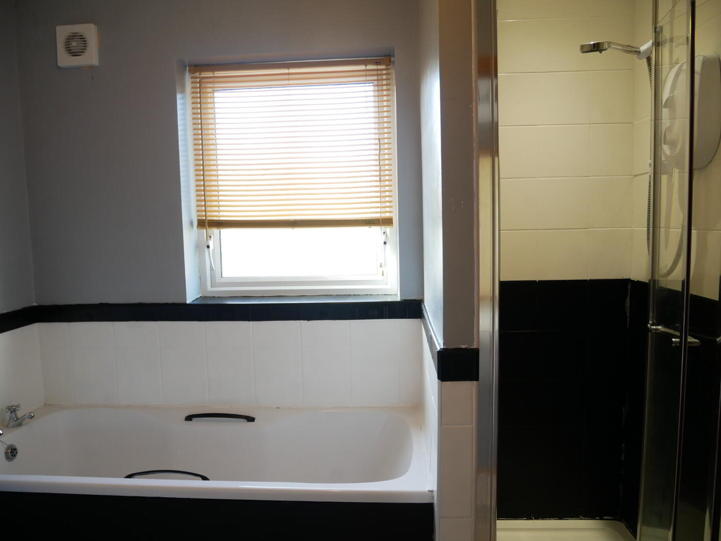Bathroom: White suite comprising bath, wc, whb, electric shower compartment, part tiled walls.