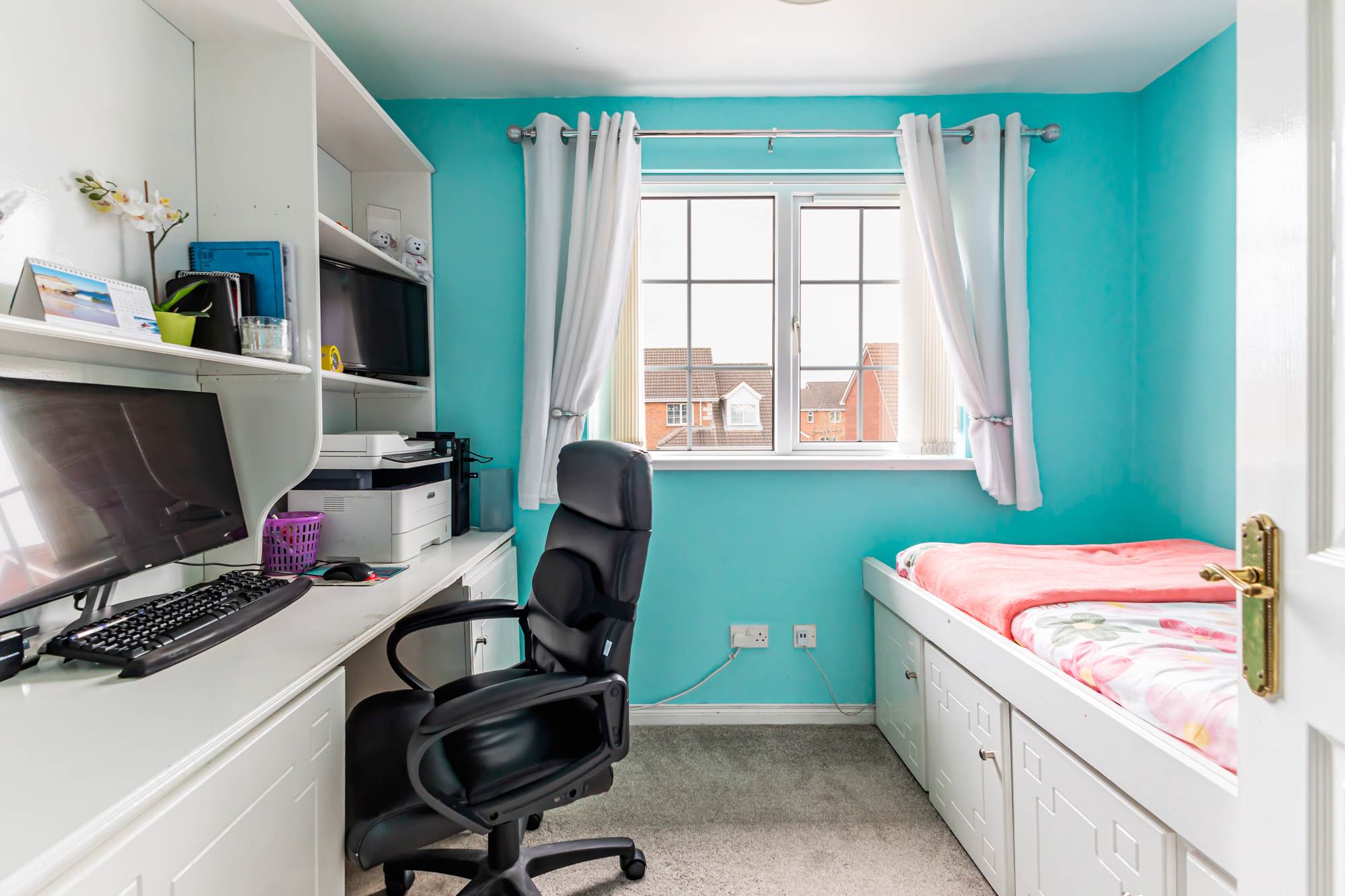 (at widest points). Outlook to rear. Laminate effect flooring.