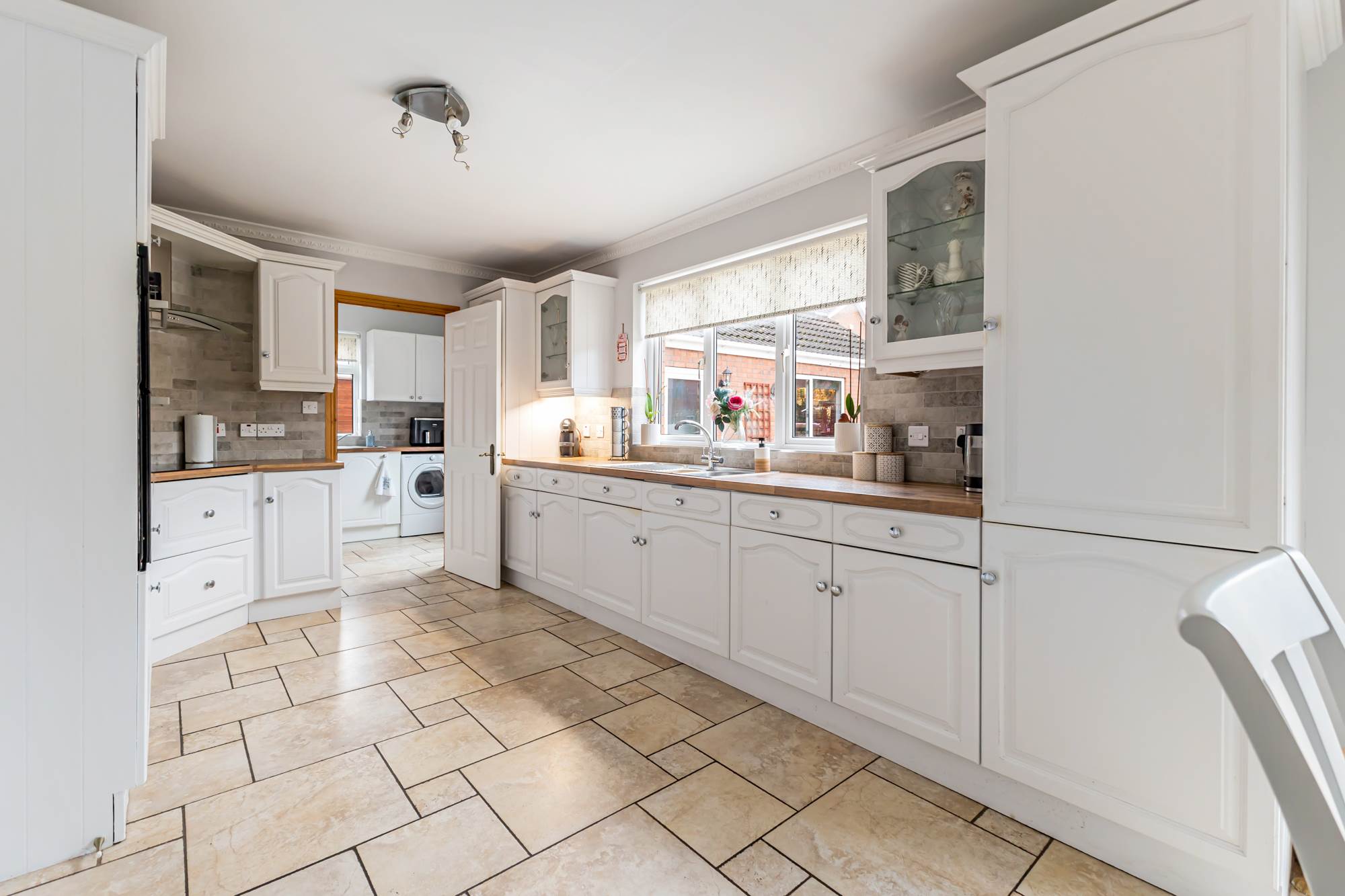 Range of high and low level units, laminate work surfaces, stainless steel single drainer sink unit with mixer tap, plumbed for washing machine, space for tumble dryer, tiled floor. Cloaks area, picture window, uPVC double glazed access door to rear garden.