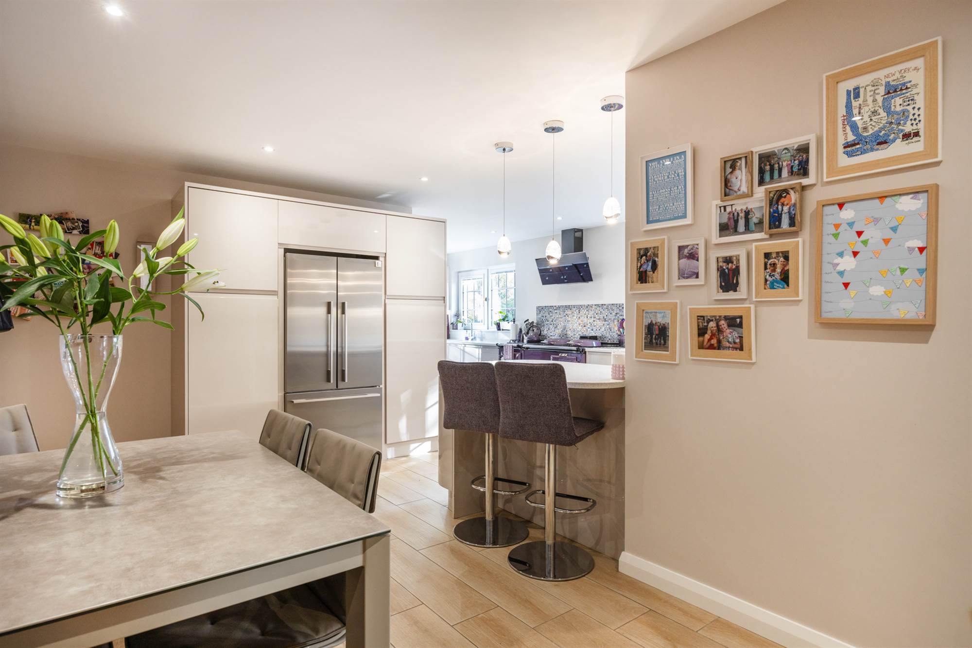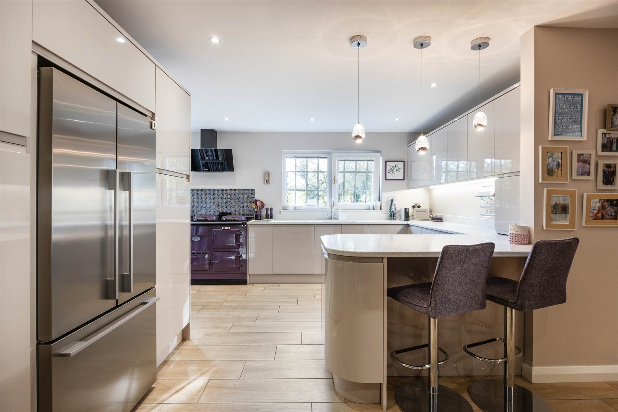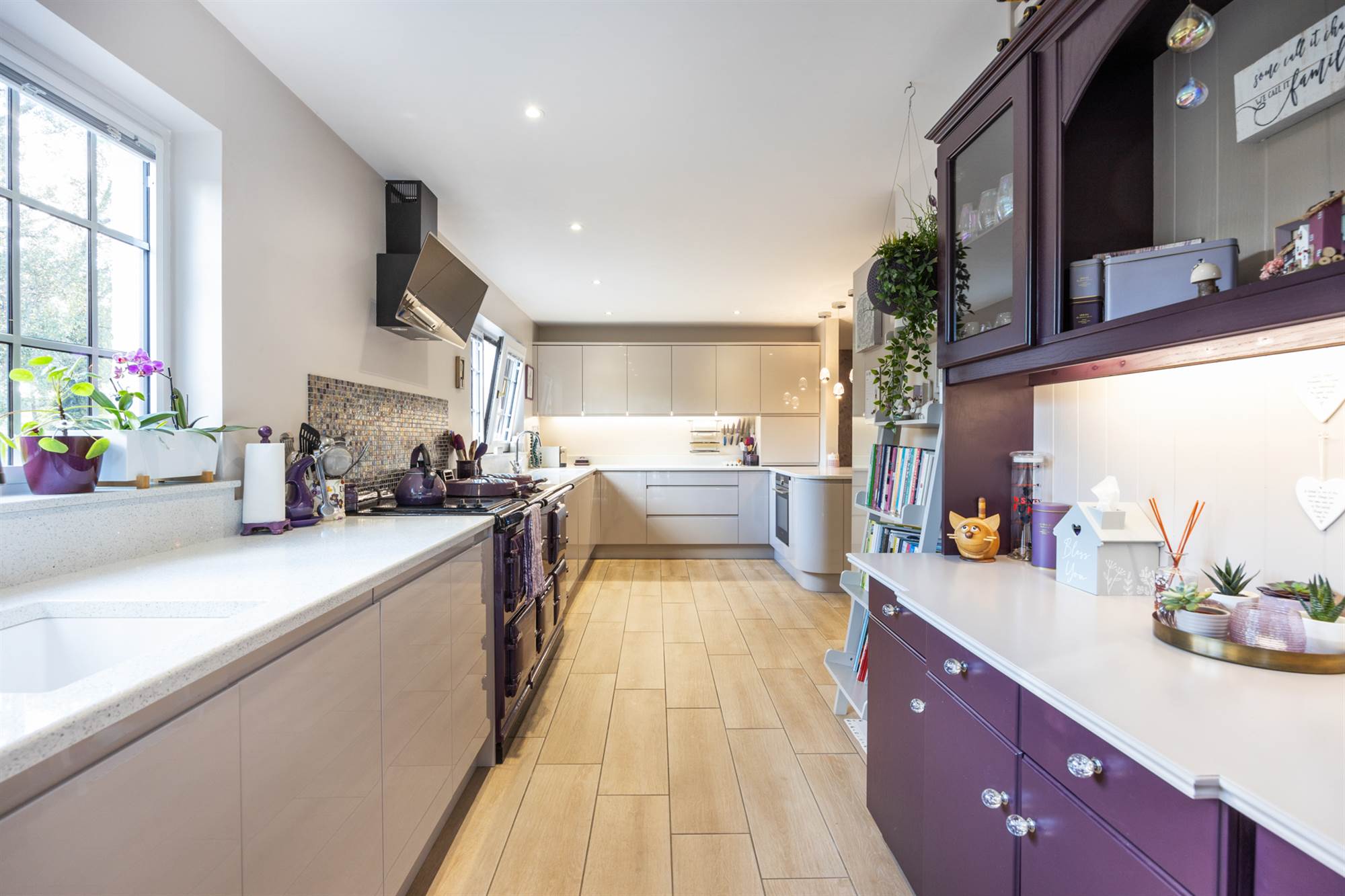 Recently fitted luxury kitchen With Quartz Worktops and Purple Aga Open Plan To Dining Area.