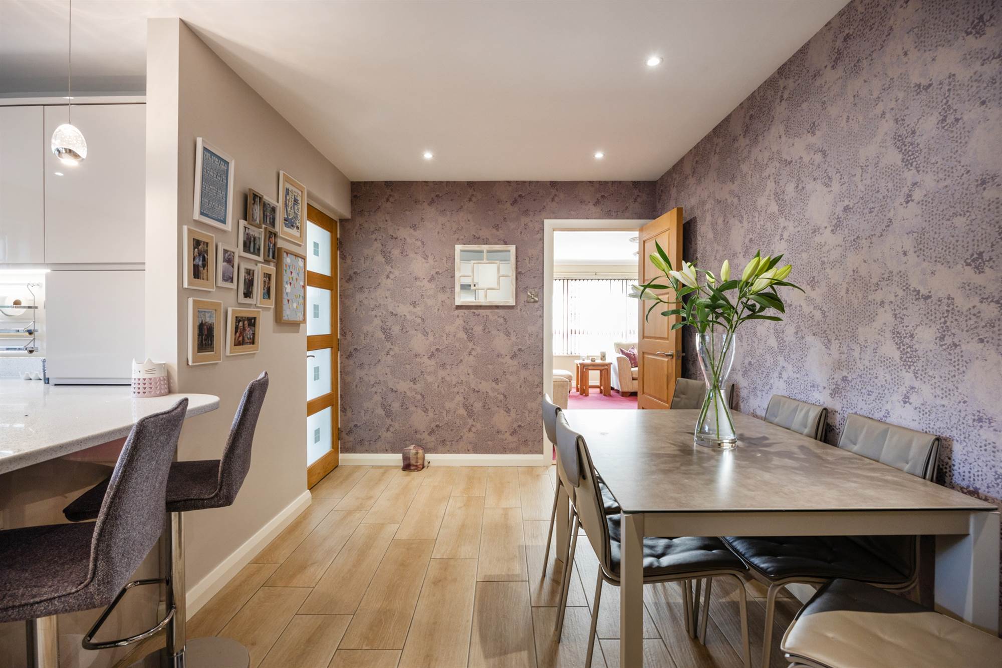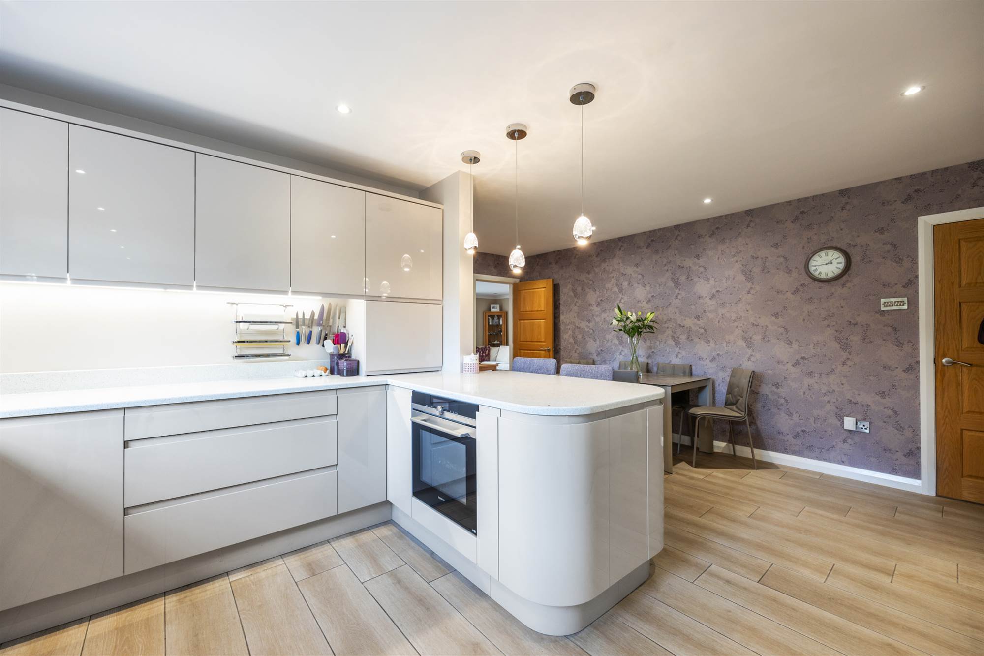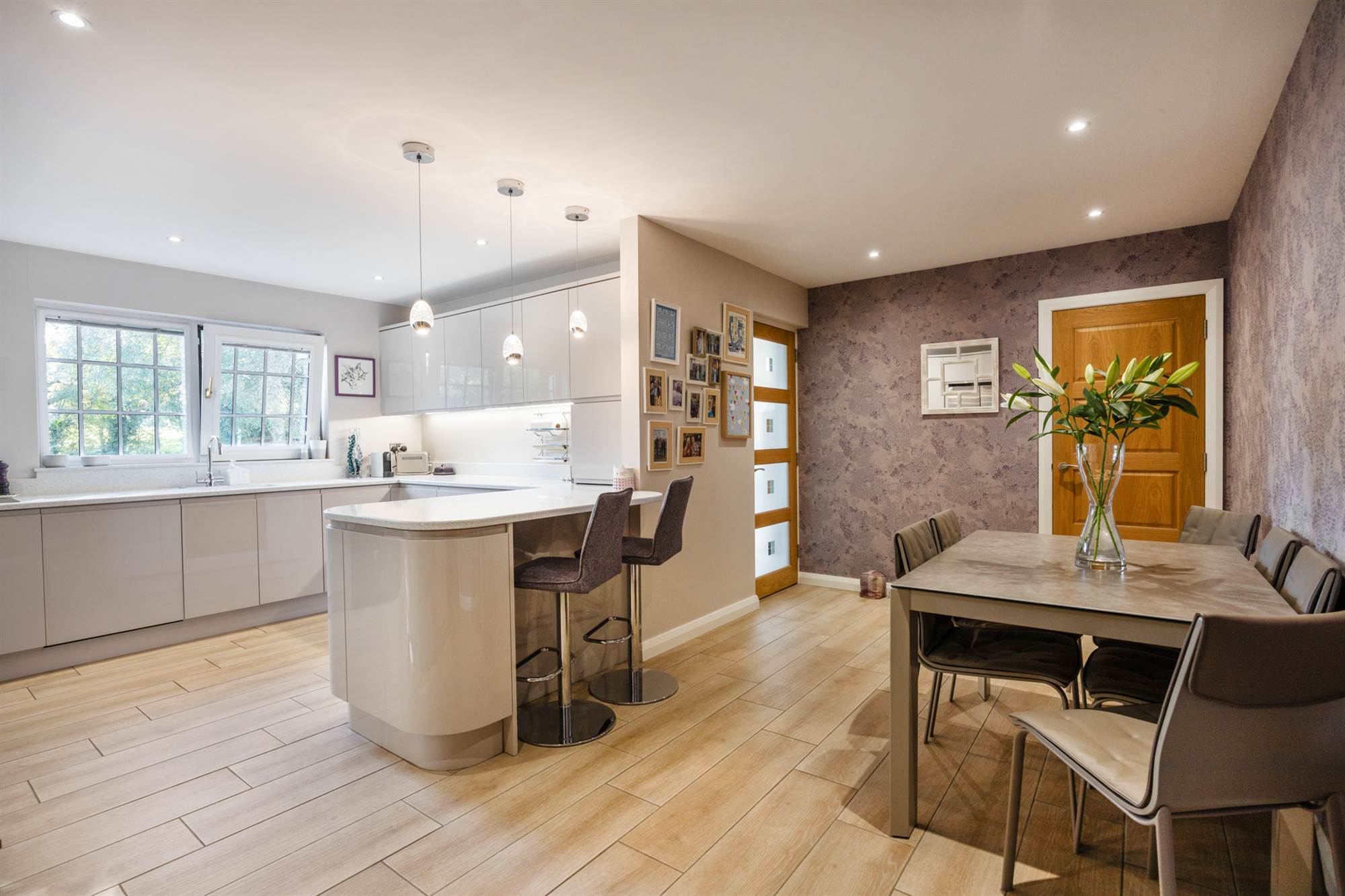 Recently fitted luxury kitchen With Quartz Worktops and Purple Aga Open Plan To Dining Area.