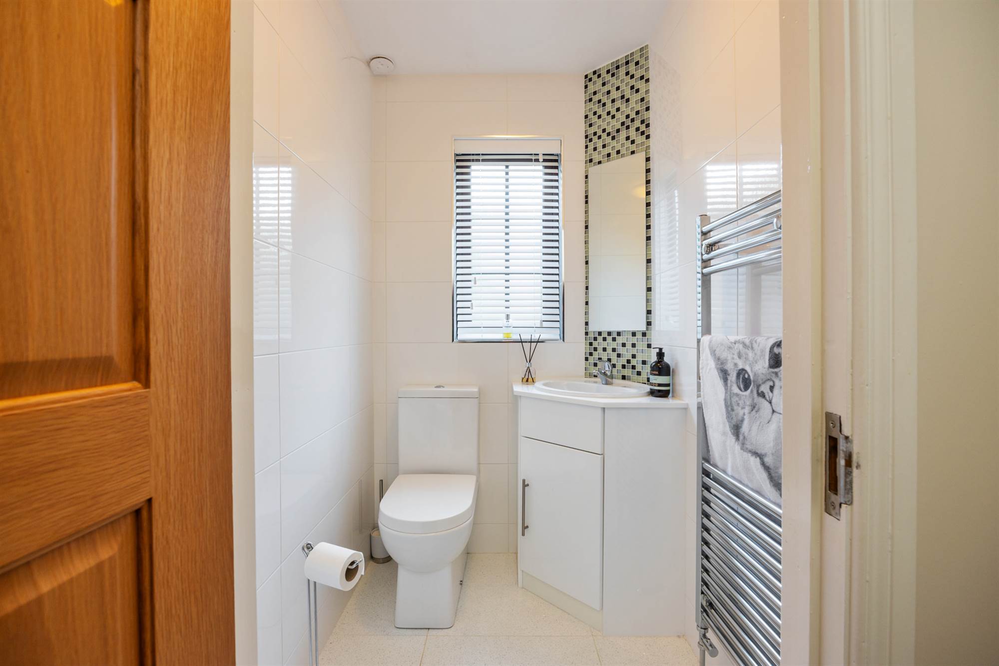 Modern white suite comprising low flush WC. Wash hand basin in vanity unit. Ceramic tiled floor and walls. Heated towel rail style radiator.
