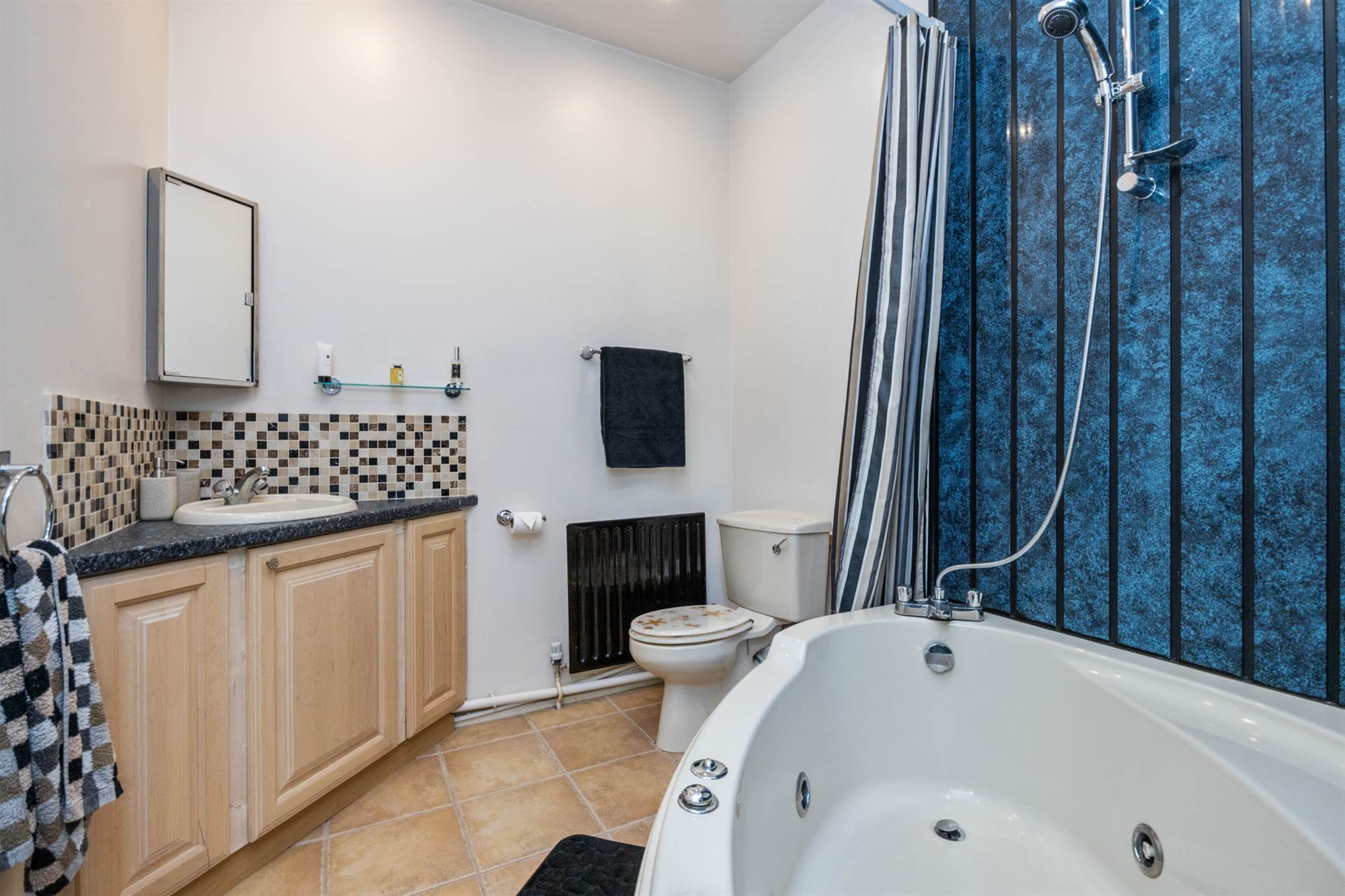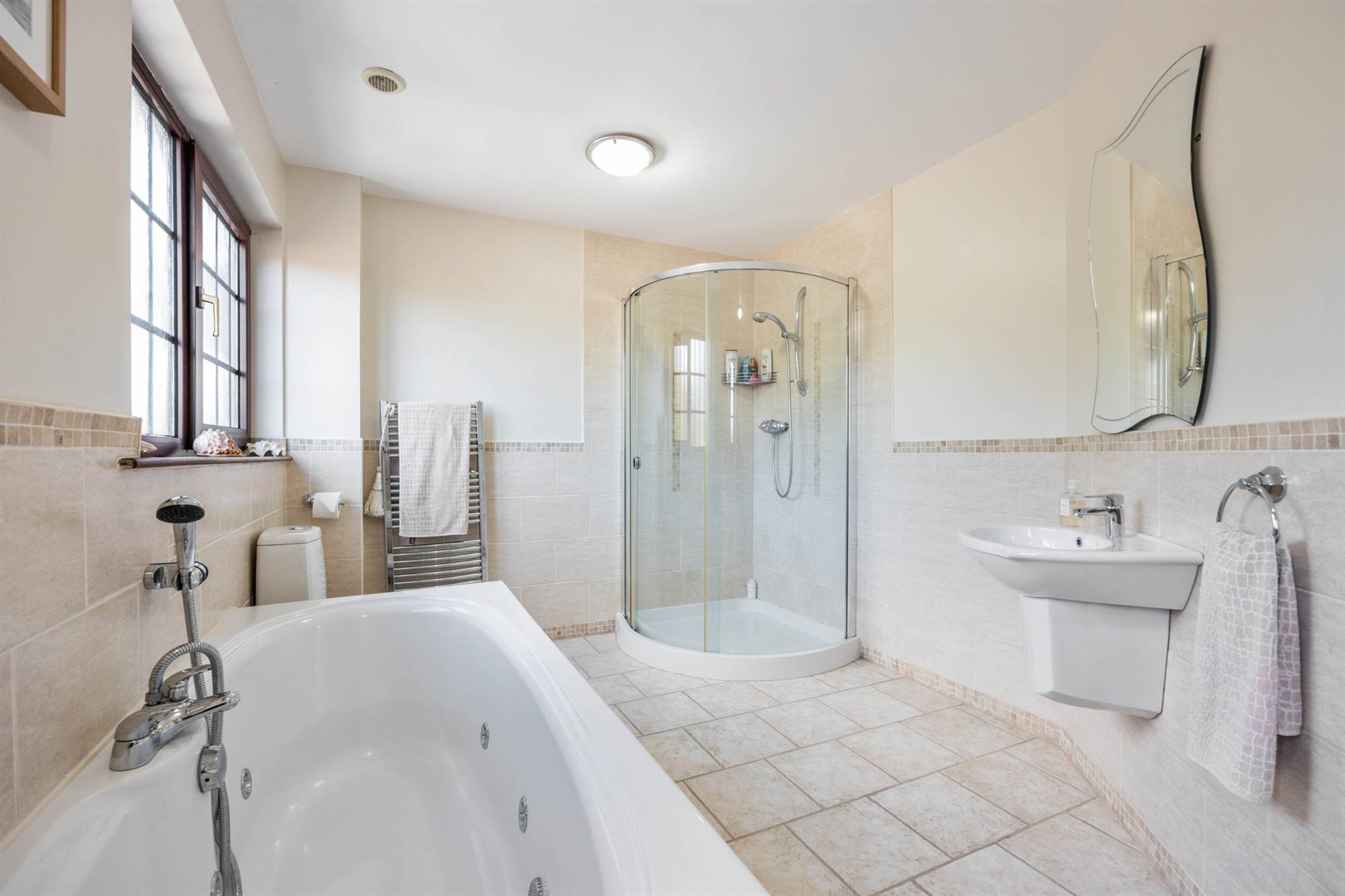 Feature jacuzzi style bath. Wash hand basin. Low flush WC. Shower cubicle with mains pressurised style. Fully tiled walls. Ceramic tiled floor.