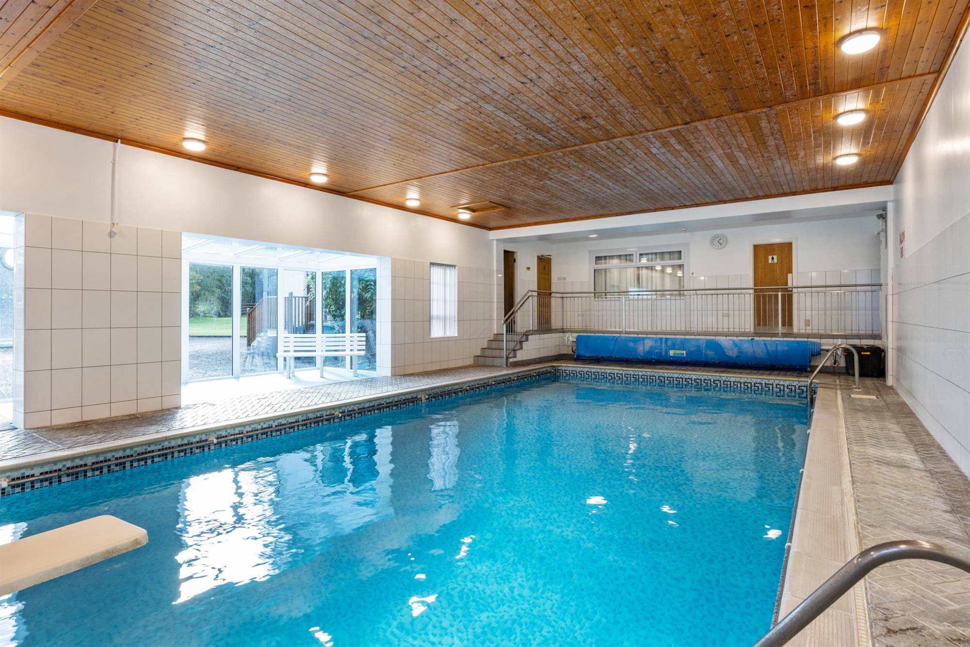 10m x5m swimming pool with an open plan PVC consevatory with access to rear of the property and gardens