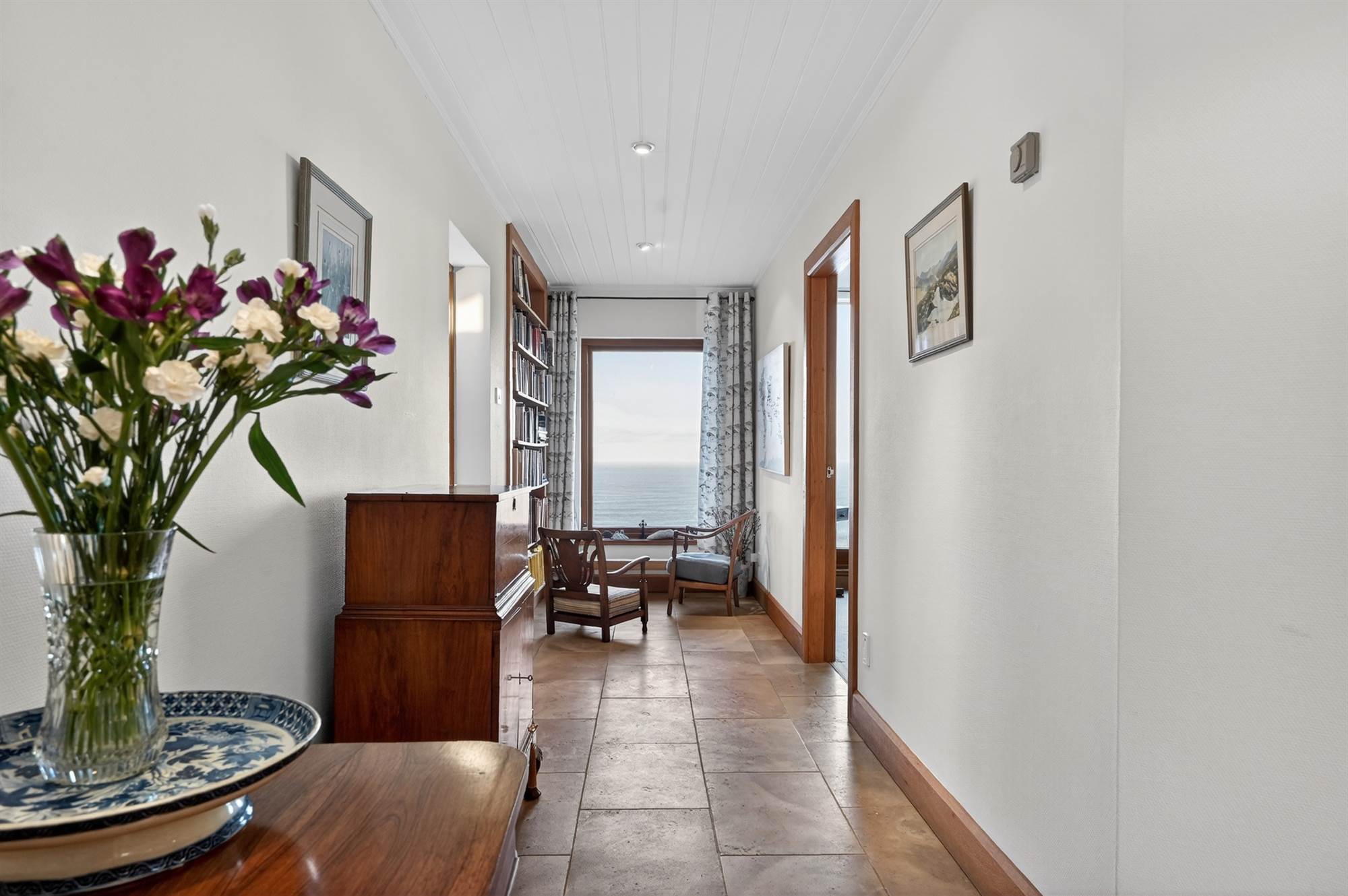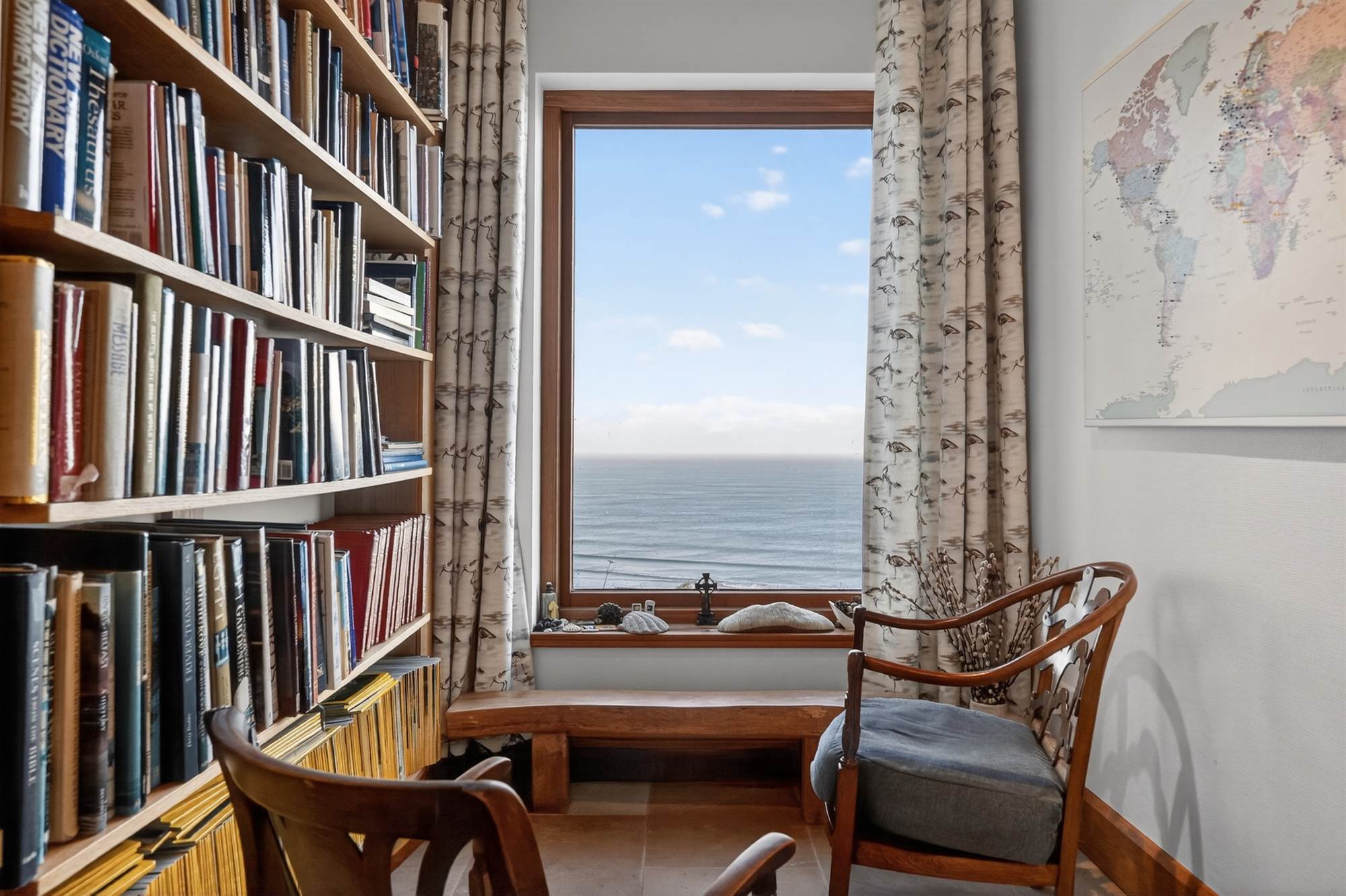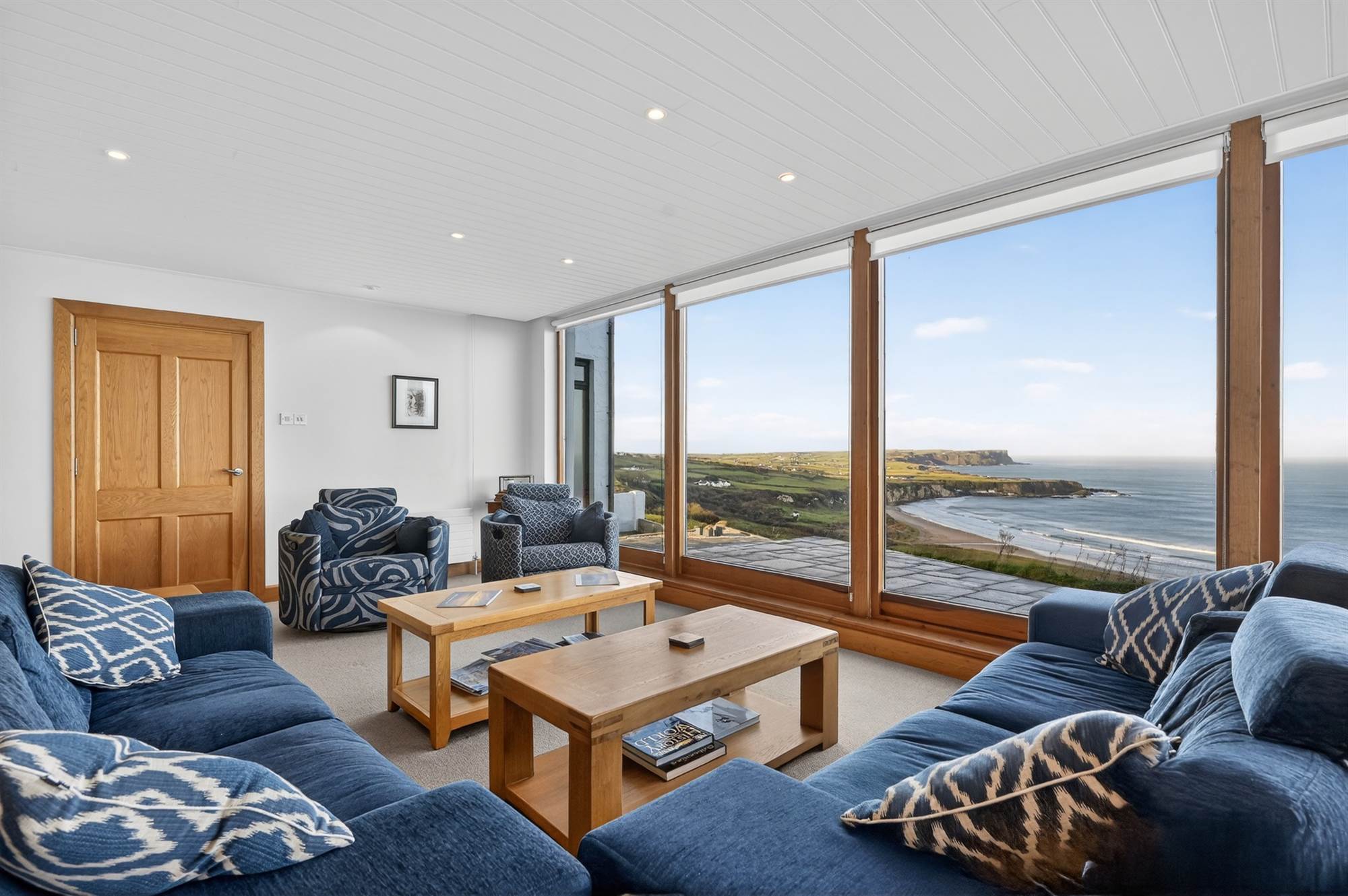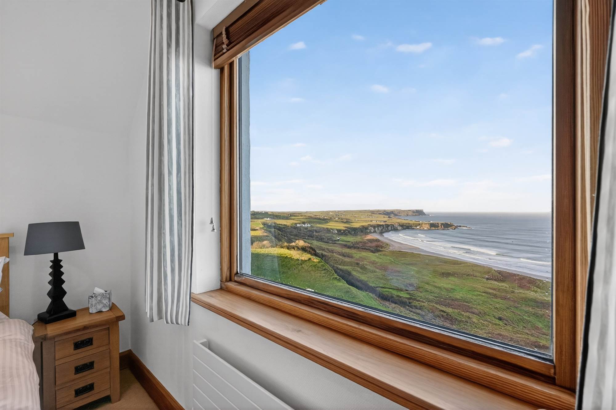 Wall to wall built-in bookshelving and cupboard space, impressive picture windows with 180 degree views over the coastline to the Giant's Causeway and cliff top walk in the west and to Rathlin Islad in the east, recessed low voltage halogen spotlights.