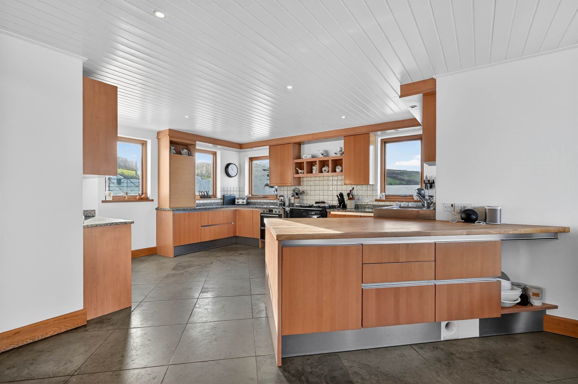 Extensive range of high and low level units, integrated oven and hob, oil fired Aga, integrated dishwasher, extensive wooden work surfaces and also polished granite work surfaces in part of the kitchen, raised double bowl stainless steel sink unit with mixer taps, tiled splashback, recessed low voltage spotlights, sandstone tiled flooring to dining area with panoramic views of Whitepark Bay and beyond, Glazed door to paved terraces.