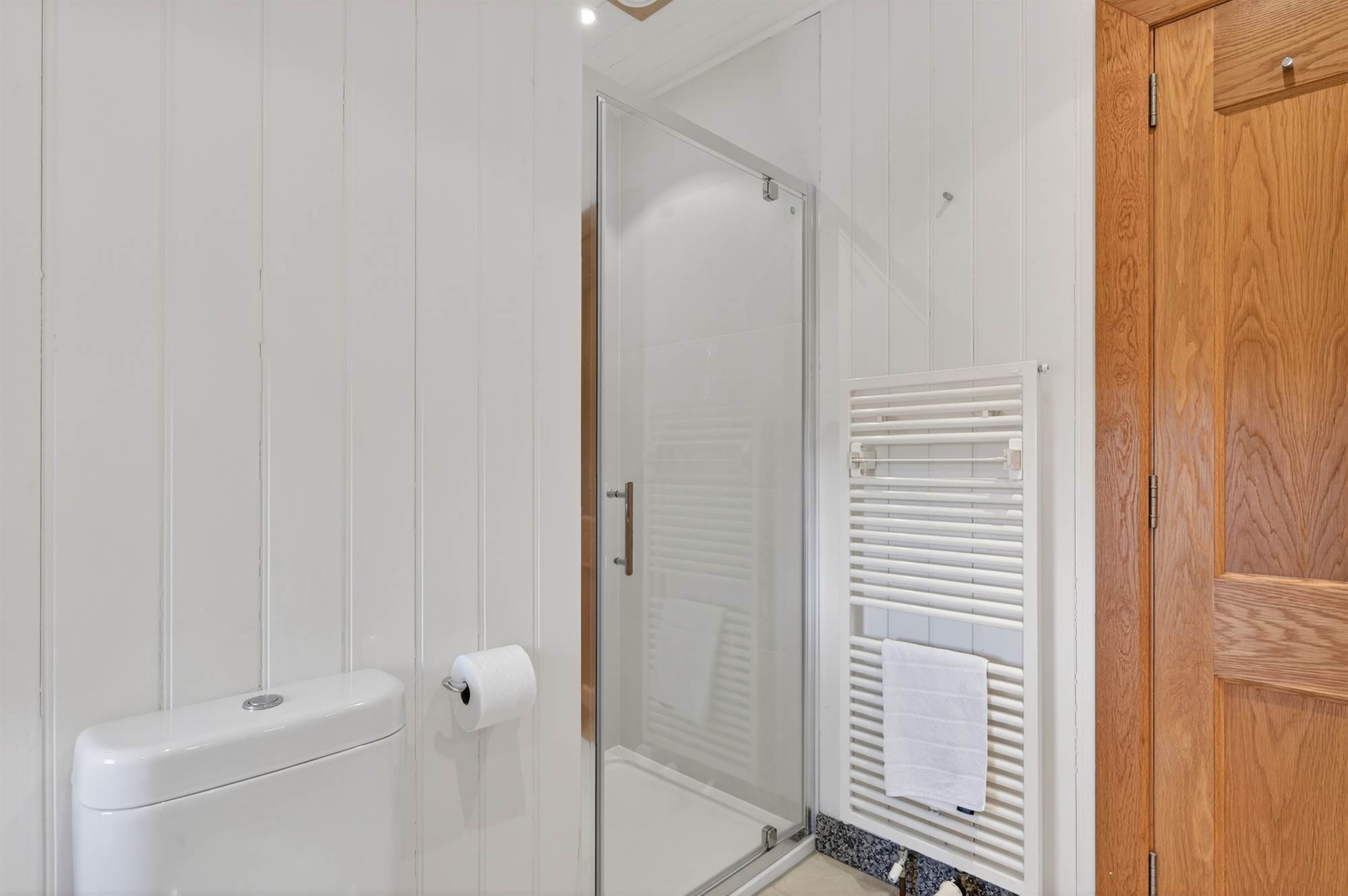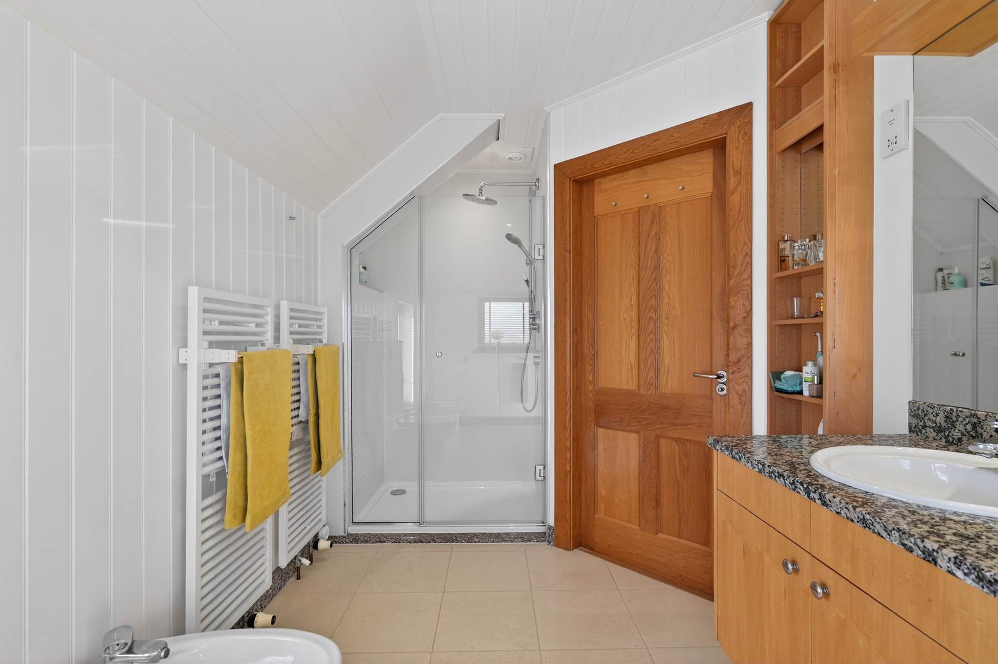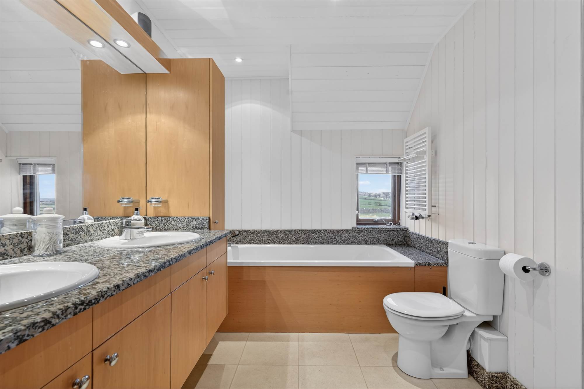 Comprising impressive double shower cubicle with drencher shower head and telephone hand shower, bidet, low flush wc, twin sink units in vanity unit with mixer taps and storage underneath, electric underfloor heating. Superb views.
