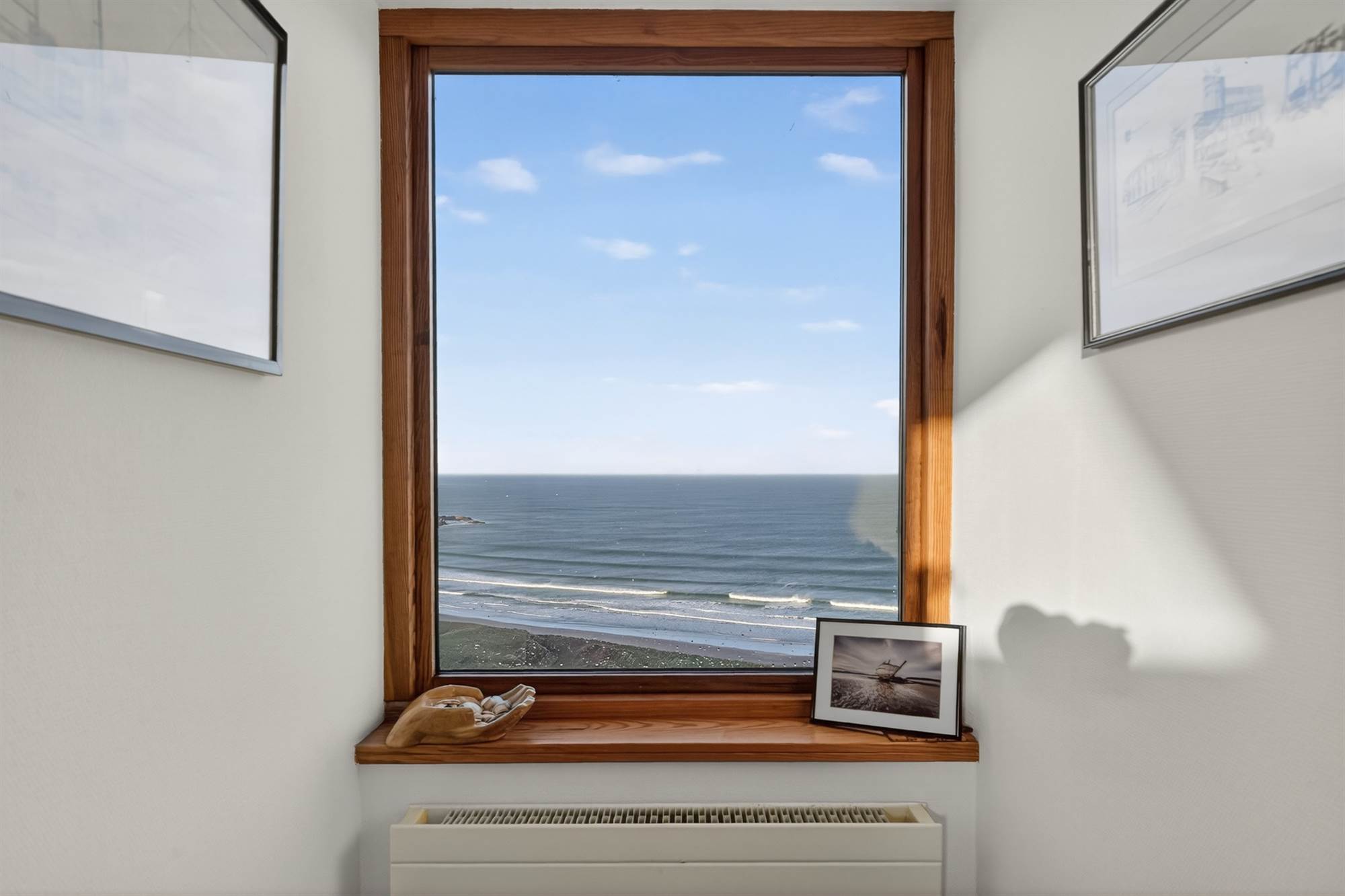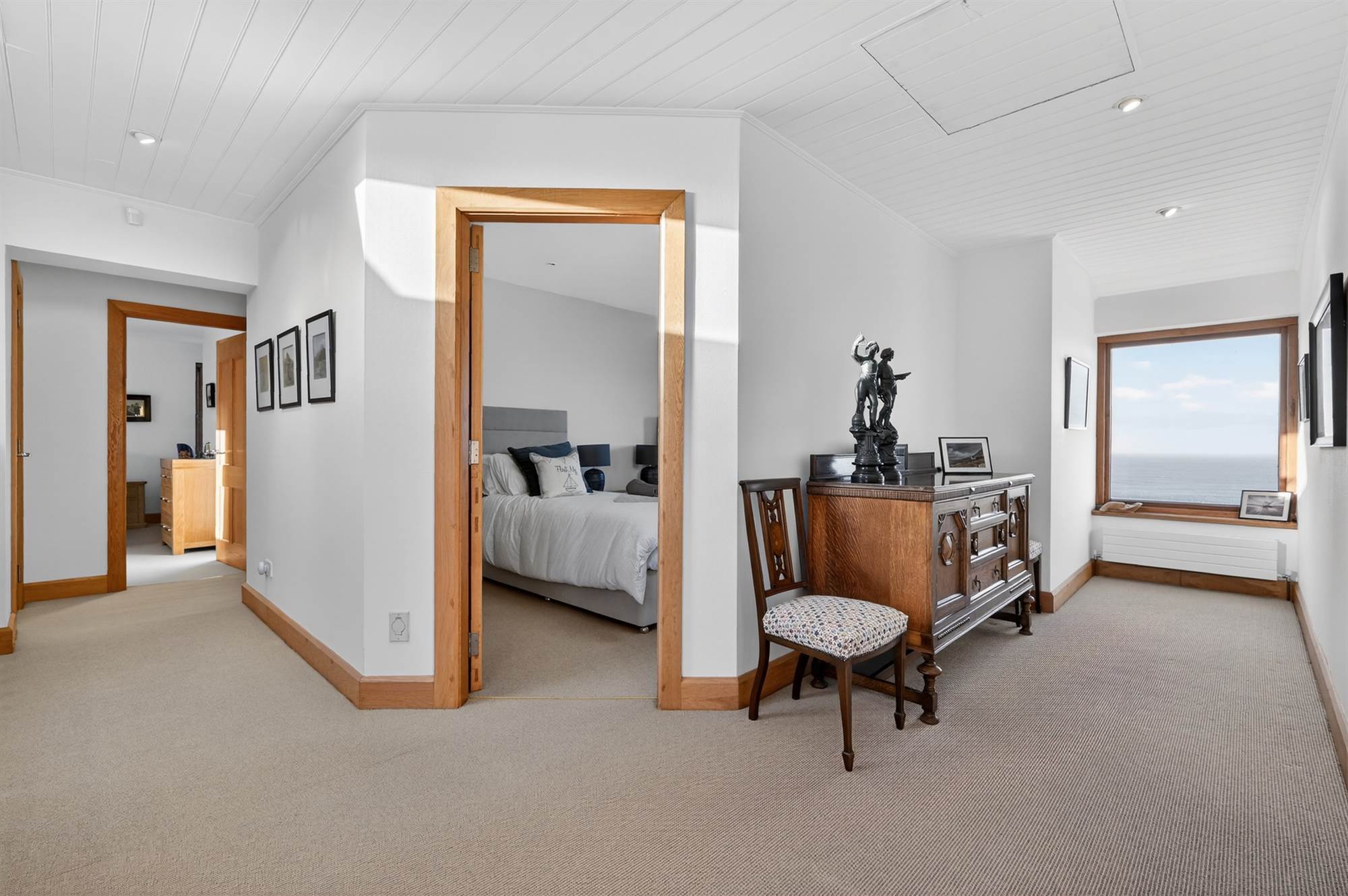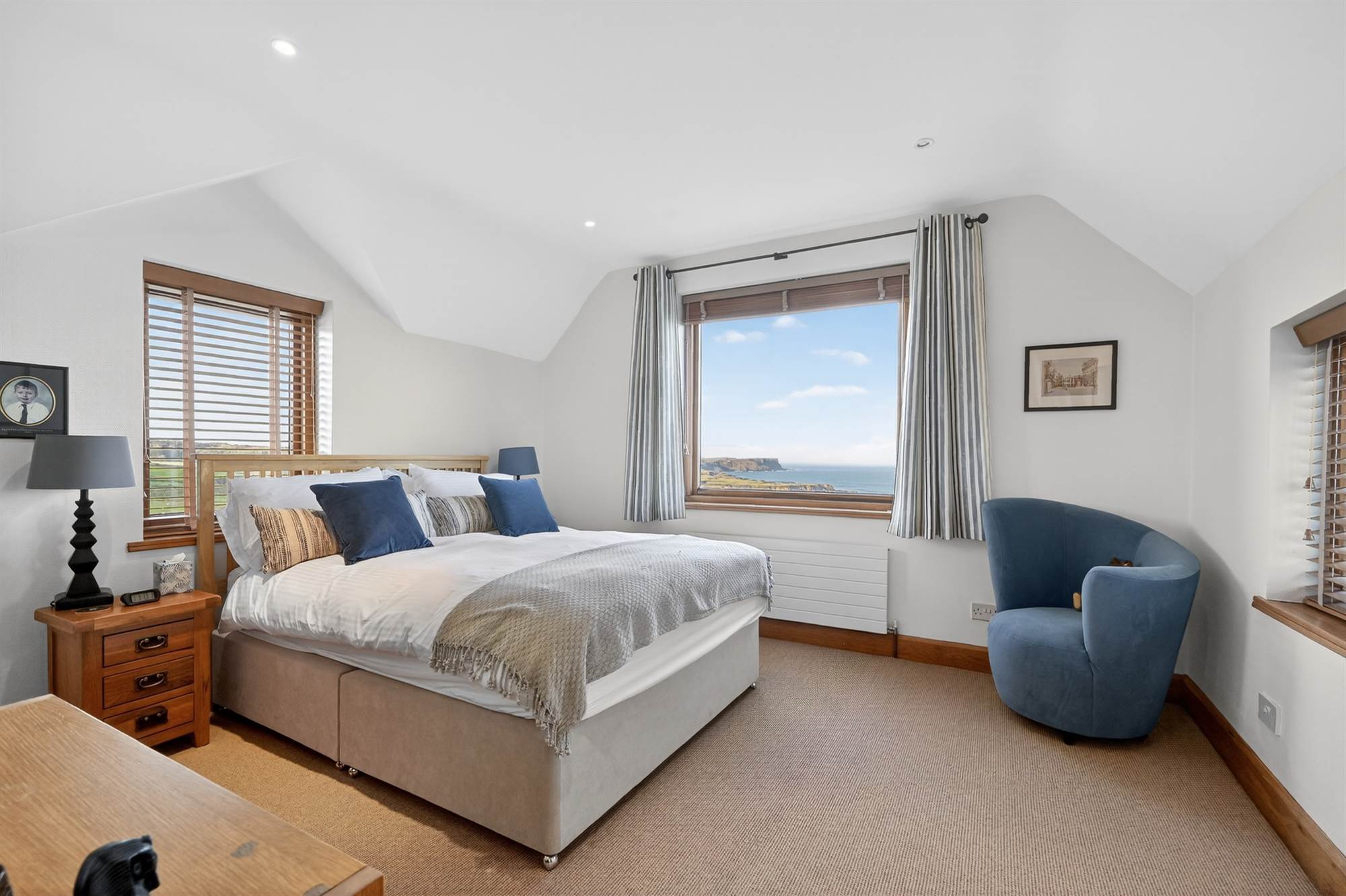 Built-in storage/TV housing, recessed lighting, views to the east towards Rathlin Island. Solid oak staircase to . . .