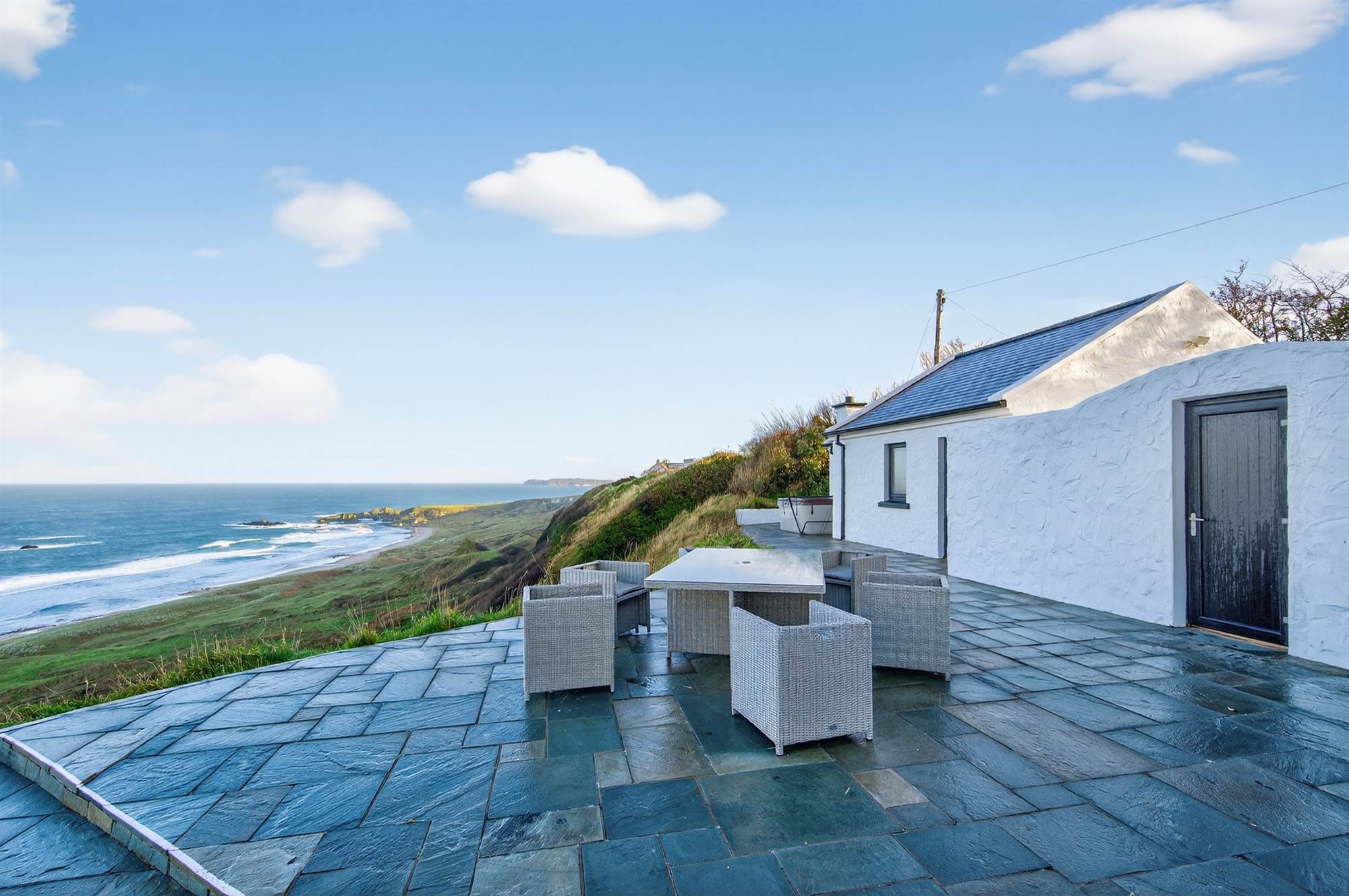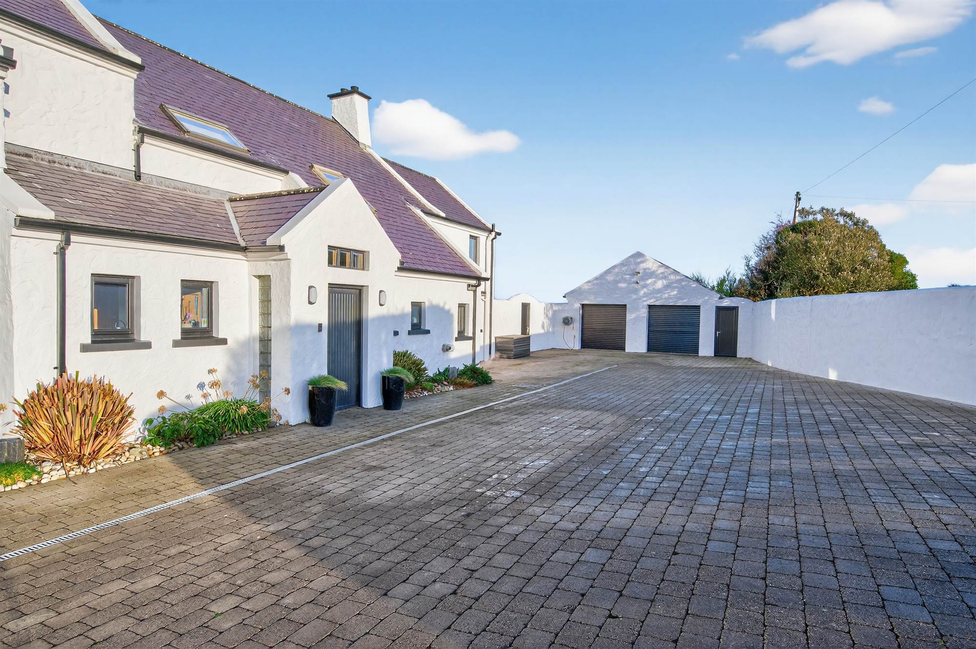 Storage shed to rear of garage, uPVC oil tank. Large paved sun terrace/verandah to rear of property with one of the premium 180 degree views in Ireland, electric point on terrace. Large brick pavior parking area to front of property.
