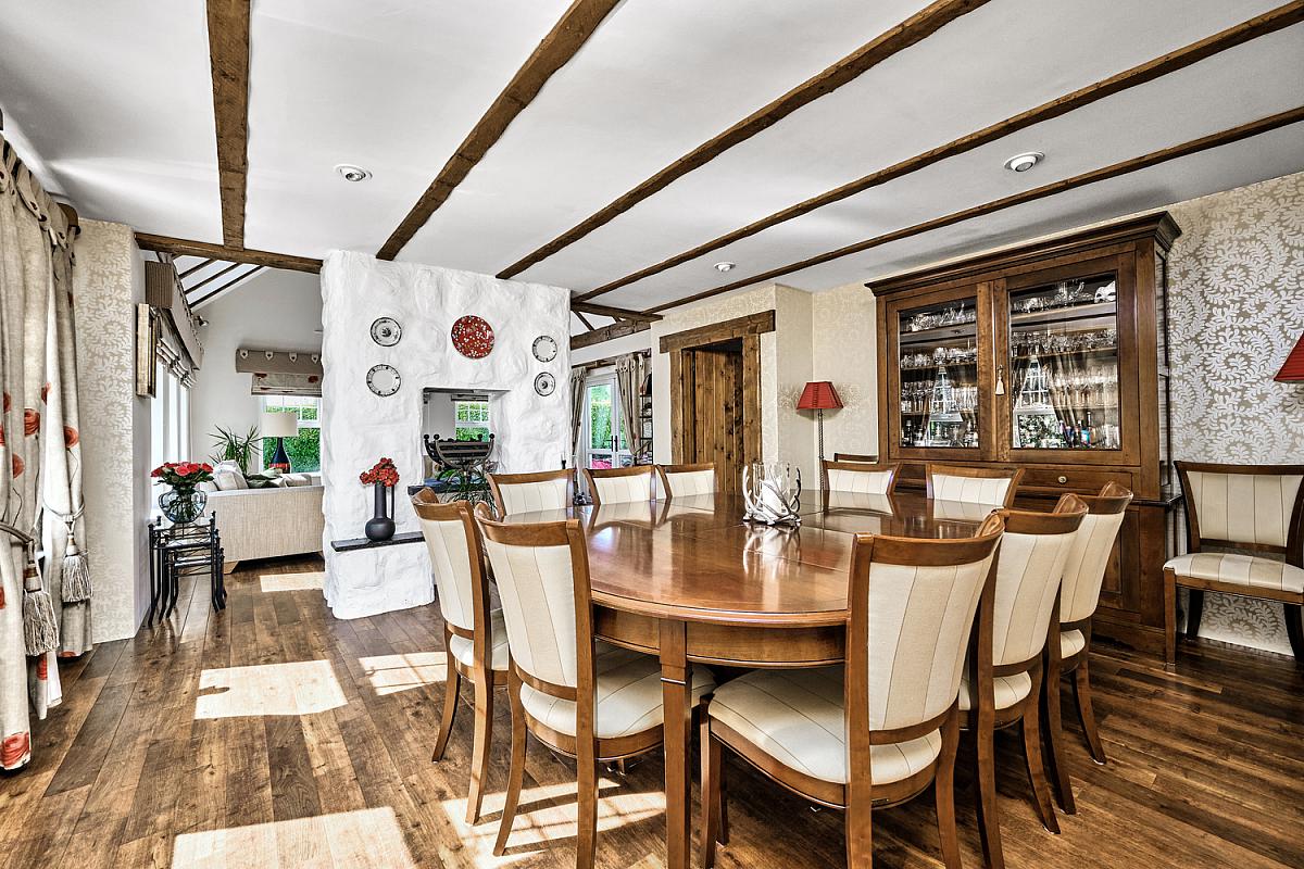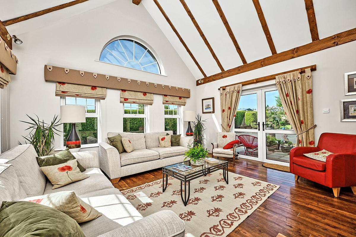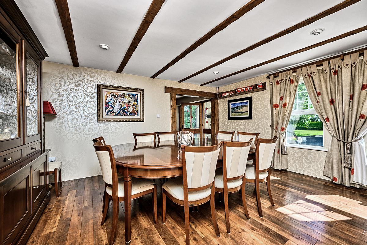 With feature pitched beamed ceiling, sunburst window, wiring for wall lights, 'Amtico' flooring and PVC French doors leading to rear patio area. Door to kitchen from dining room.
