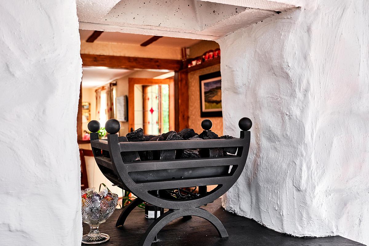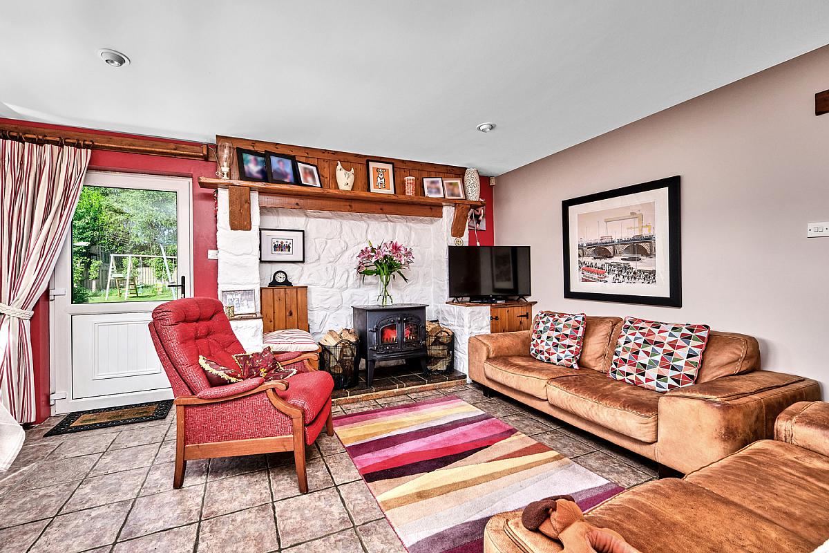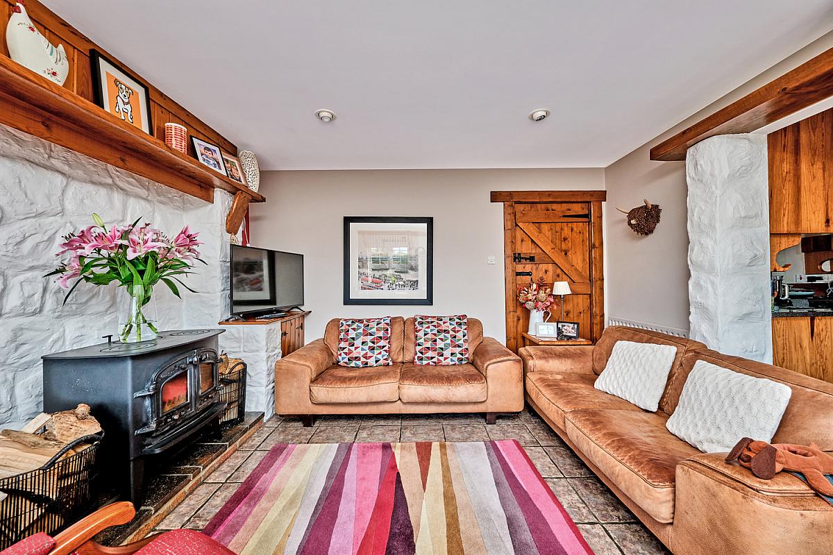 With white stone effect recess and surround with log burner with tiled hearth, eyeball spotlighting, tiled floor and latch door leading to rear hallway. Wide door leading to rear.