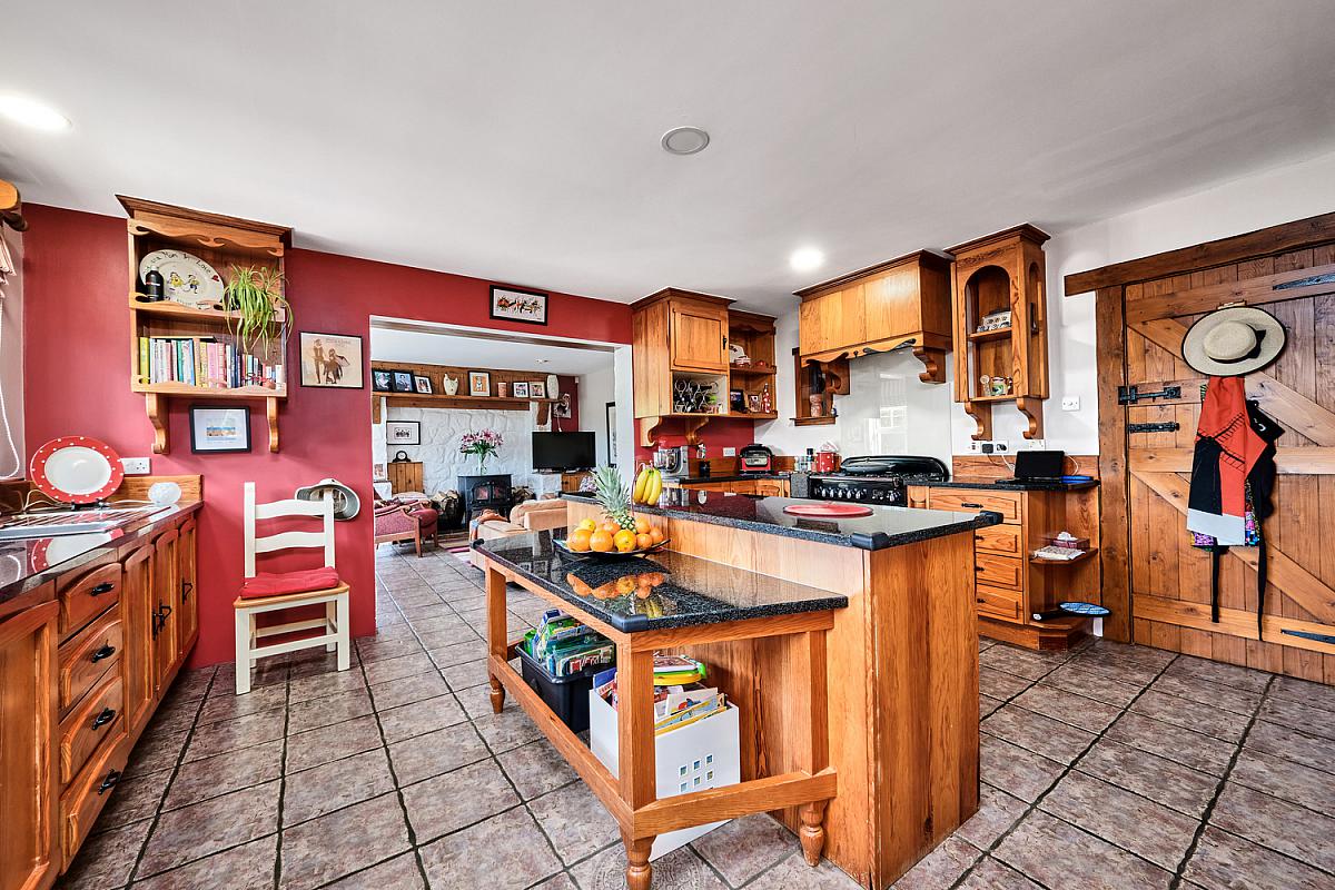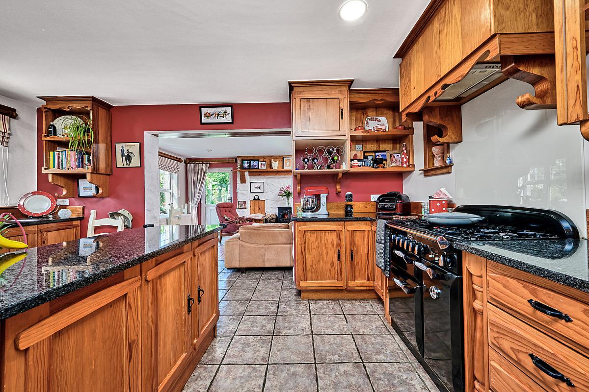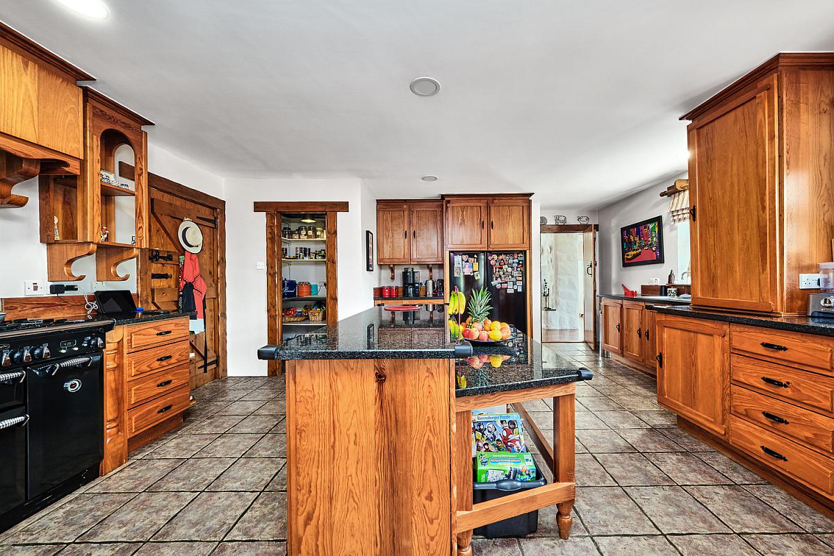 With bespoke kitchen comprising single drainer stainless steel sink unit, high and low level solid pine units, gas/electric range master, extractor fan above, space for full length fridge freezer, integrated dishwasher with additional single drainer stainless steel sink unit above, granite worktops with pine upstands and sills, matching island with additional dining space and storage below, corner pull out units, recessed lighting, tiled floor, walk in pantry with tiled floor, pine shelving, recess and stained glass window through to hallway.