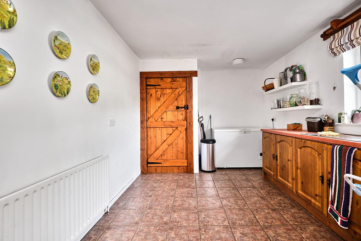 With single drainer stainless steel sink unit, low level units, chest freezer space, plumbed for automatic washing machine, cupboard housing boiler, tiled floor and door leading to: