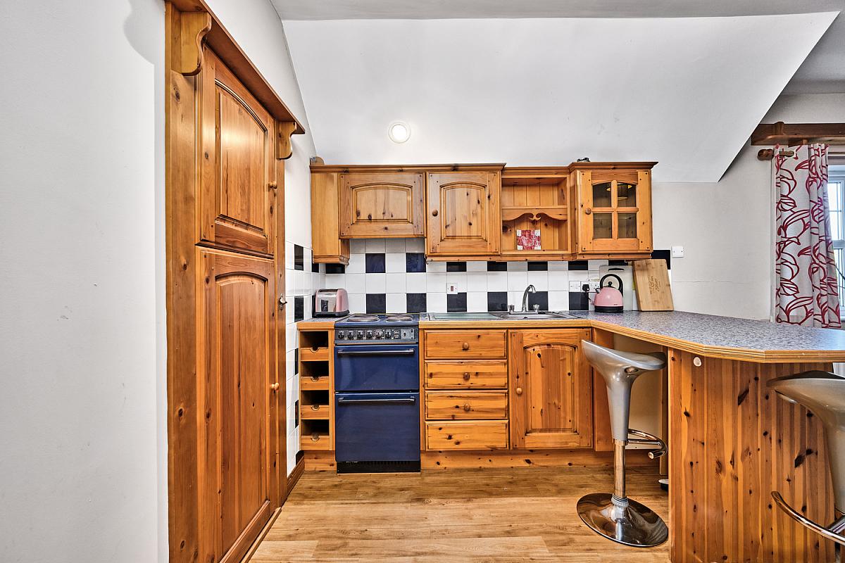With single drainer stainless steel sink unit, high and low level built in units with tiling between, integrated cooker, extractor fan above, space for fridge, glass display cabinets, shelved cupboard, breakfast bar with seating area and shelving.