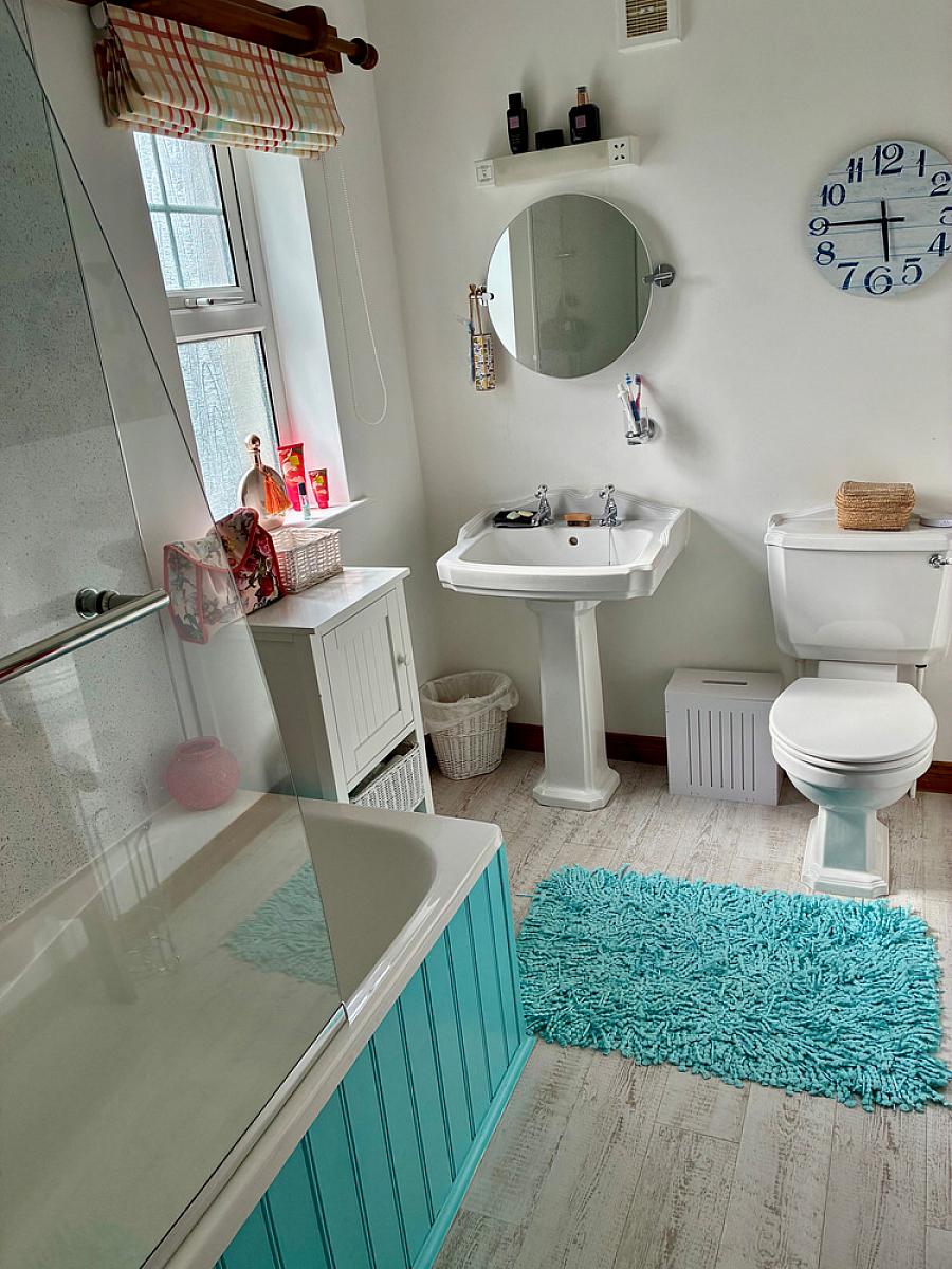 With white suite comprising w.c., wash hand basin, panelled surround bath with telephone hand shower and Karndean floor.