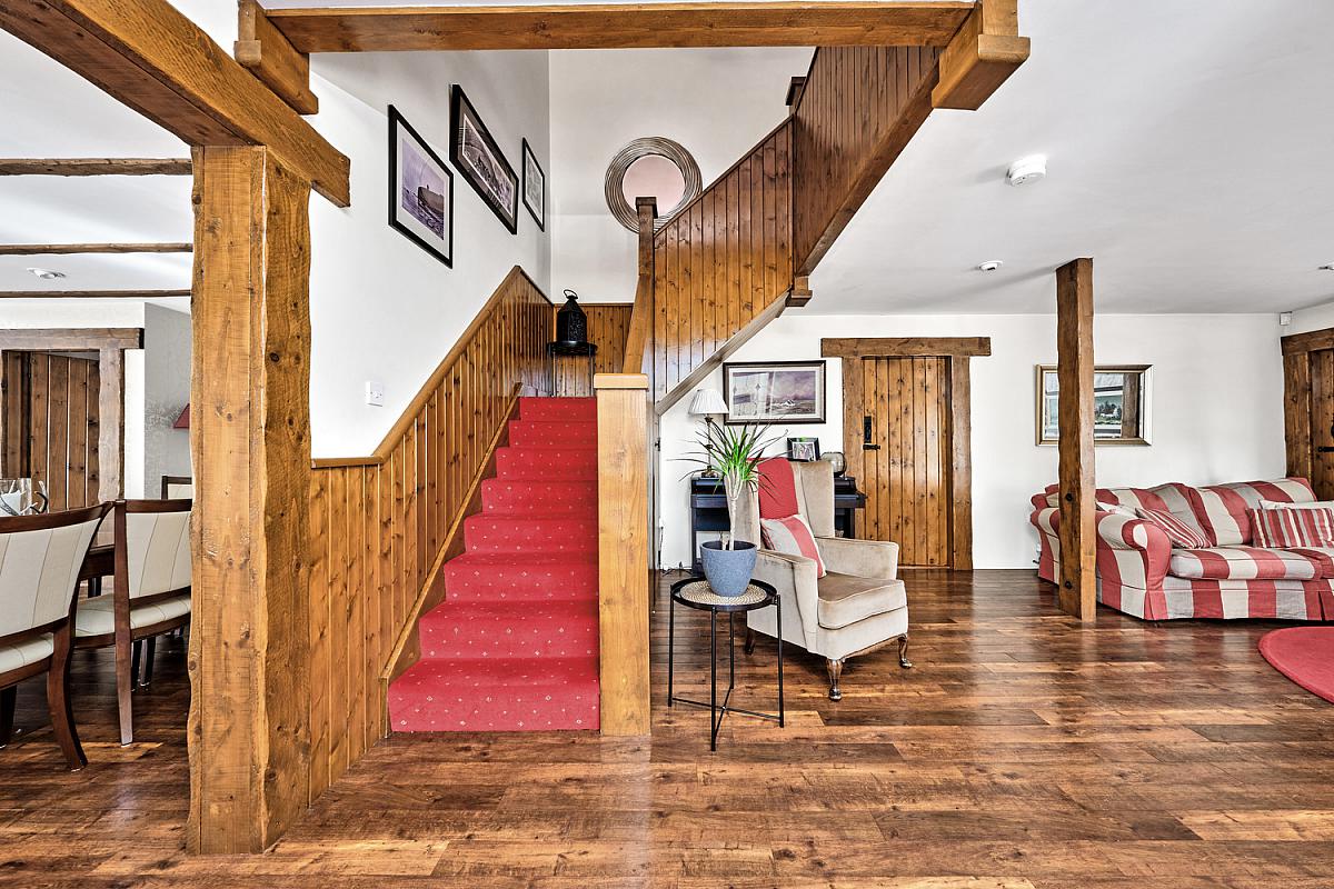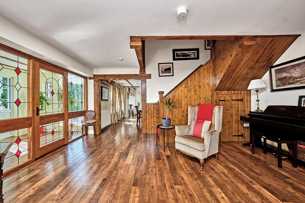 With feature beamed ceiling, floor to ceiling windows, 'Amtico' flooring and glass panels and stained glass windows leading to: