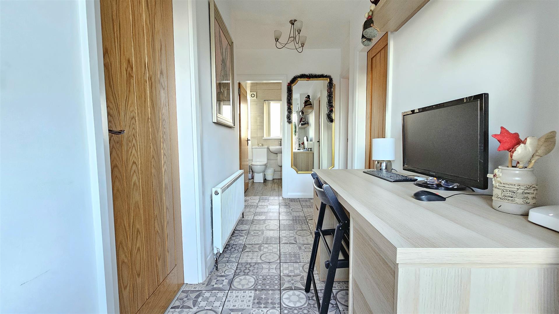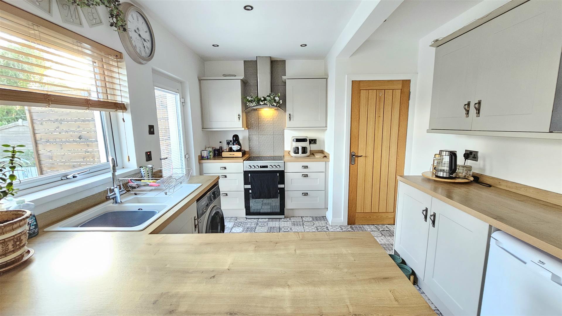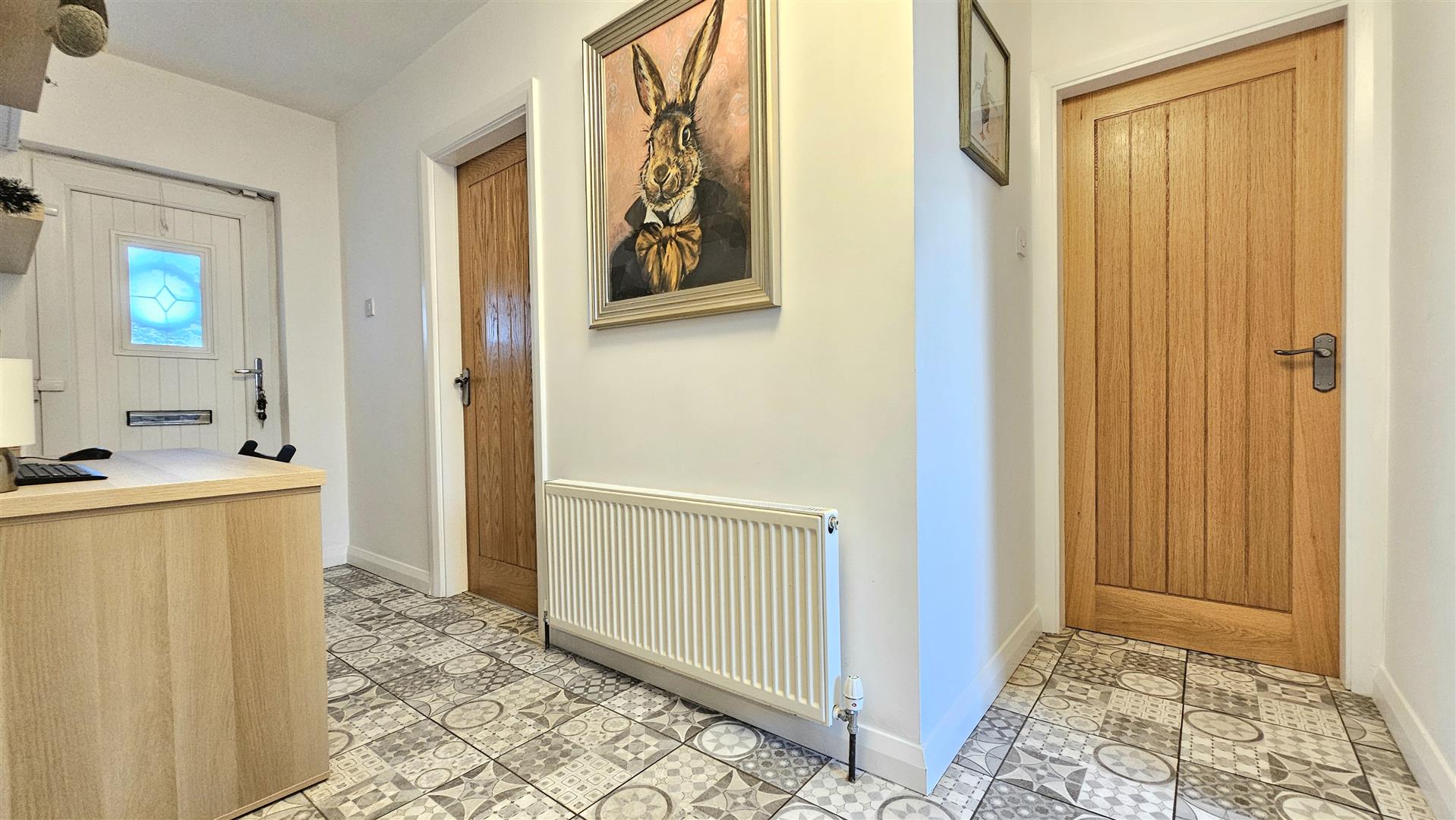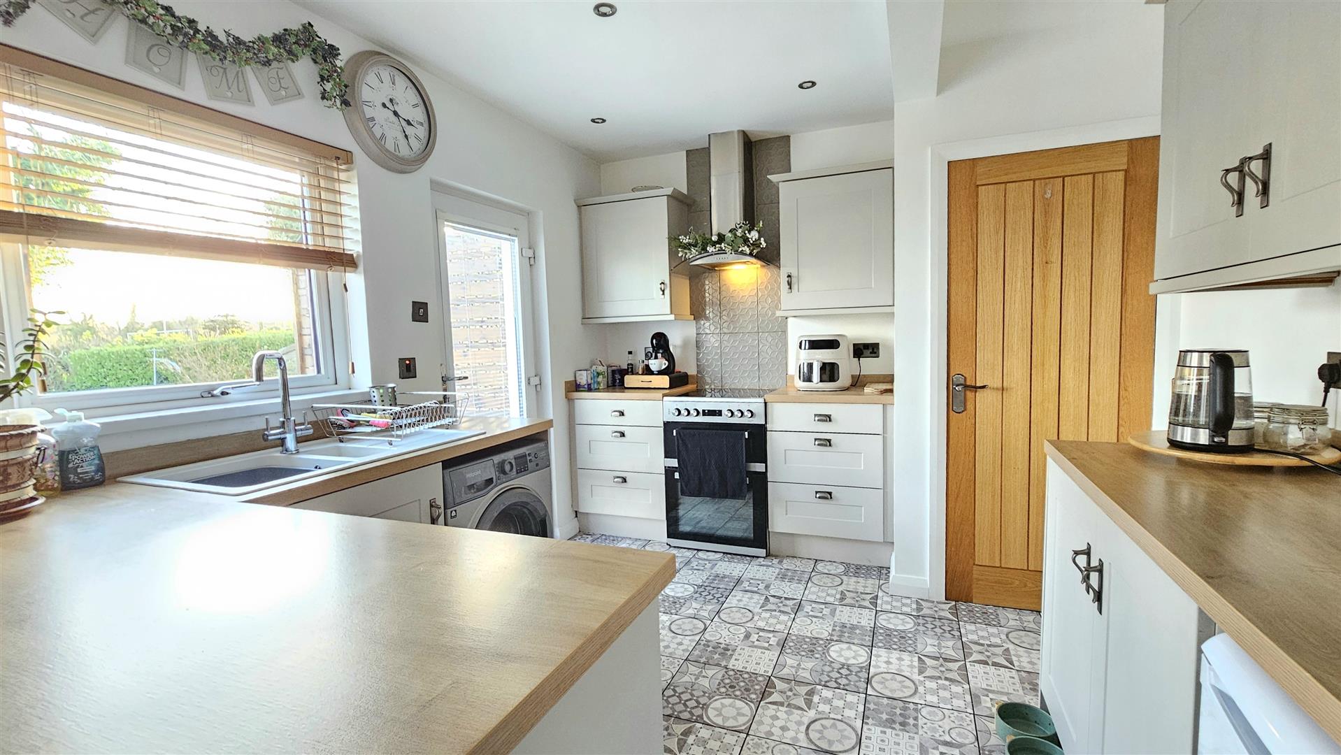 Oak internal doors and modern Spanish style tiling through the entrance hall and kitchen