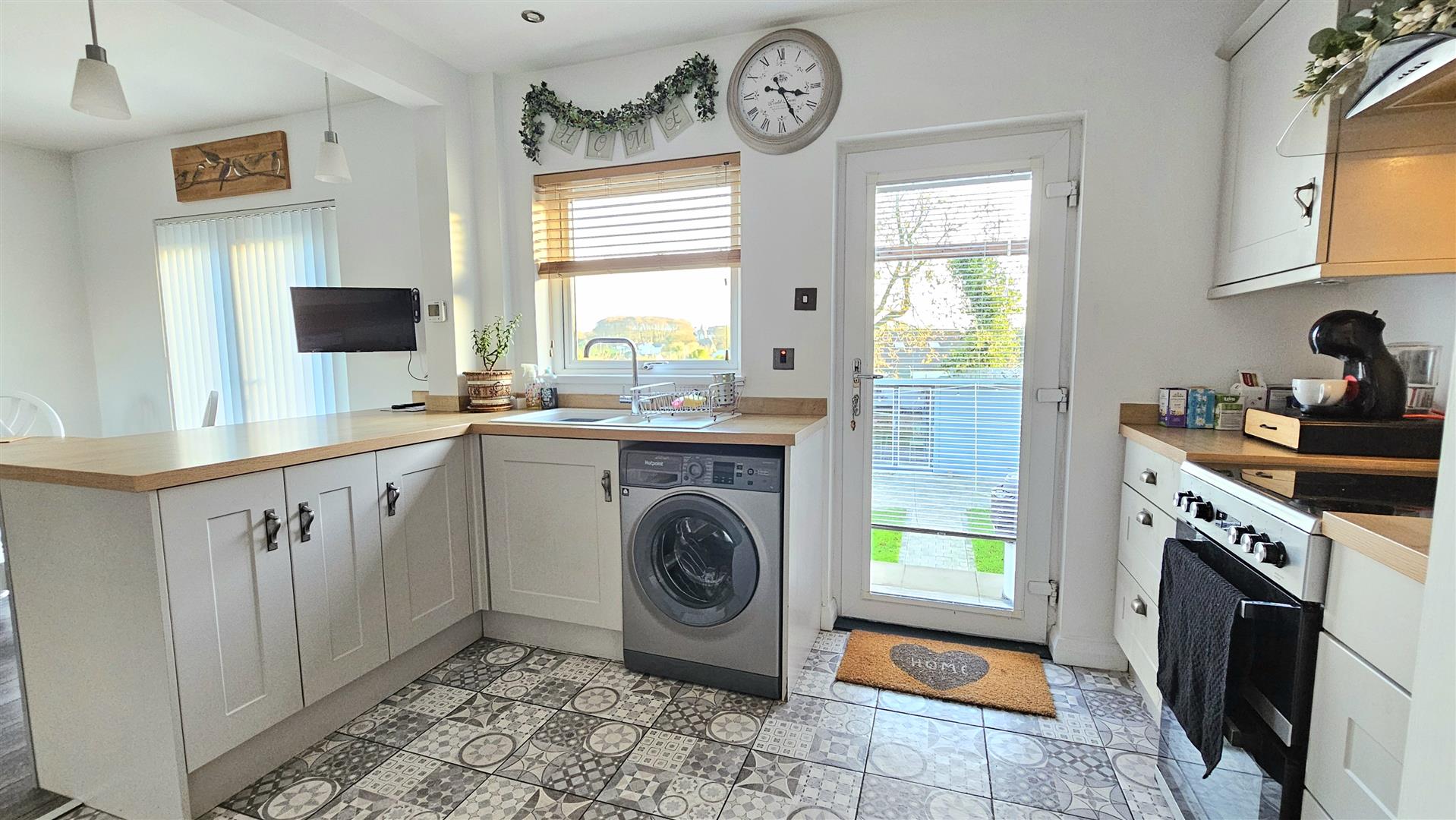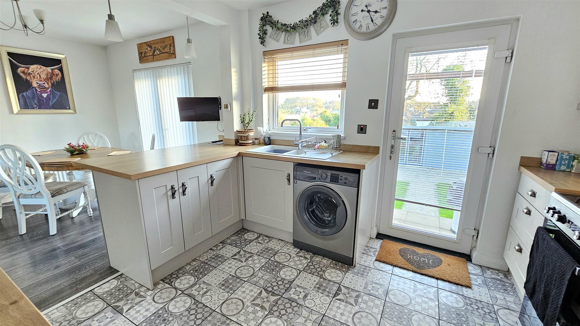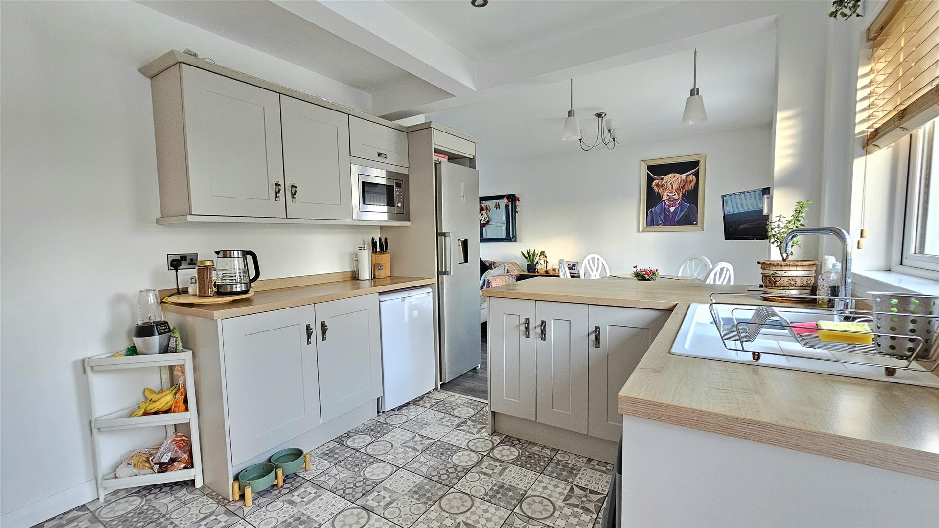 Kitchen boasts contemporary shaker style units, Oak style worktops and breakfast bar