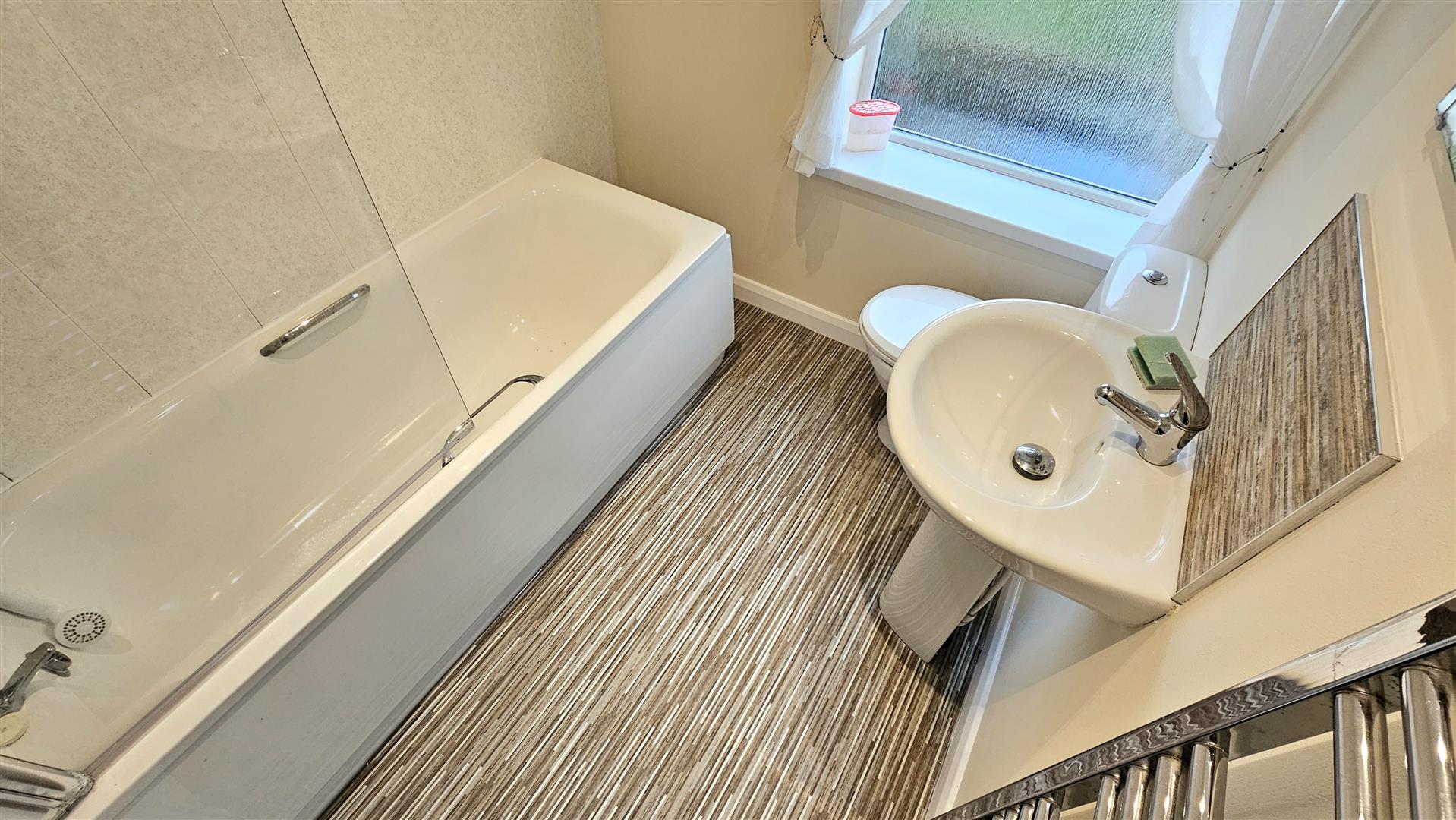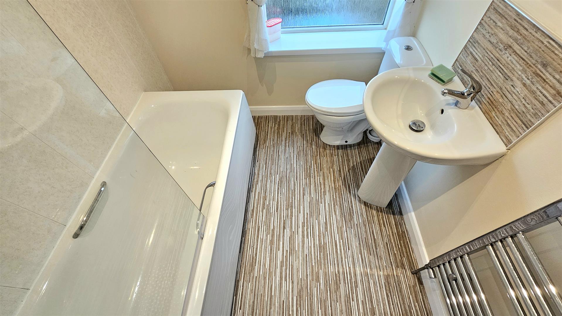 White bathroom suite with an electric shower and chrome heated towel rail