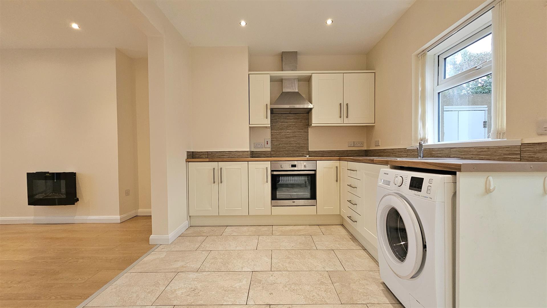 The accommodation comprises two well-proportioned bedrooms and a 12'9 x 10'11 lounge featuring an electric fire and laminate flooring, while the shaker style kitchen is fitted with a built-in stainless steel oven, hob and extractor. The bathroom incorporates a white suite with an electric shower and chrome heated towel rail, and further benefits include a floored loft space accessed via a wooden staircase, double glazed windows in PVC frames, a composite front door and an oil fired heating system.