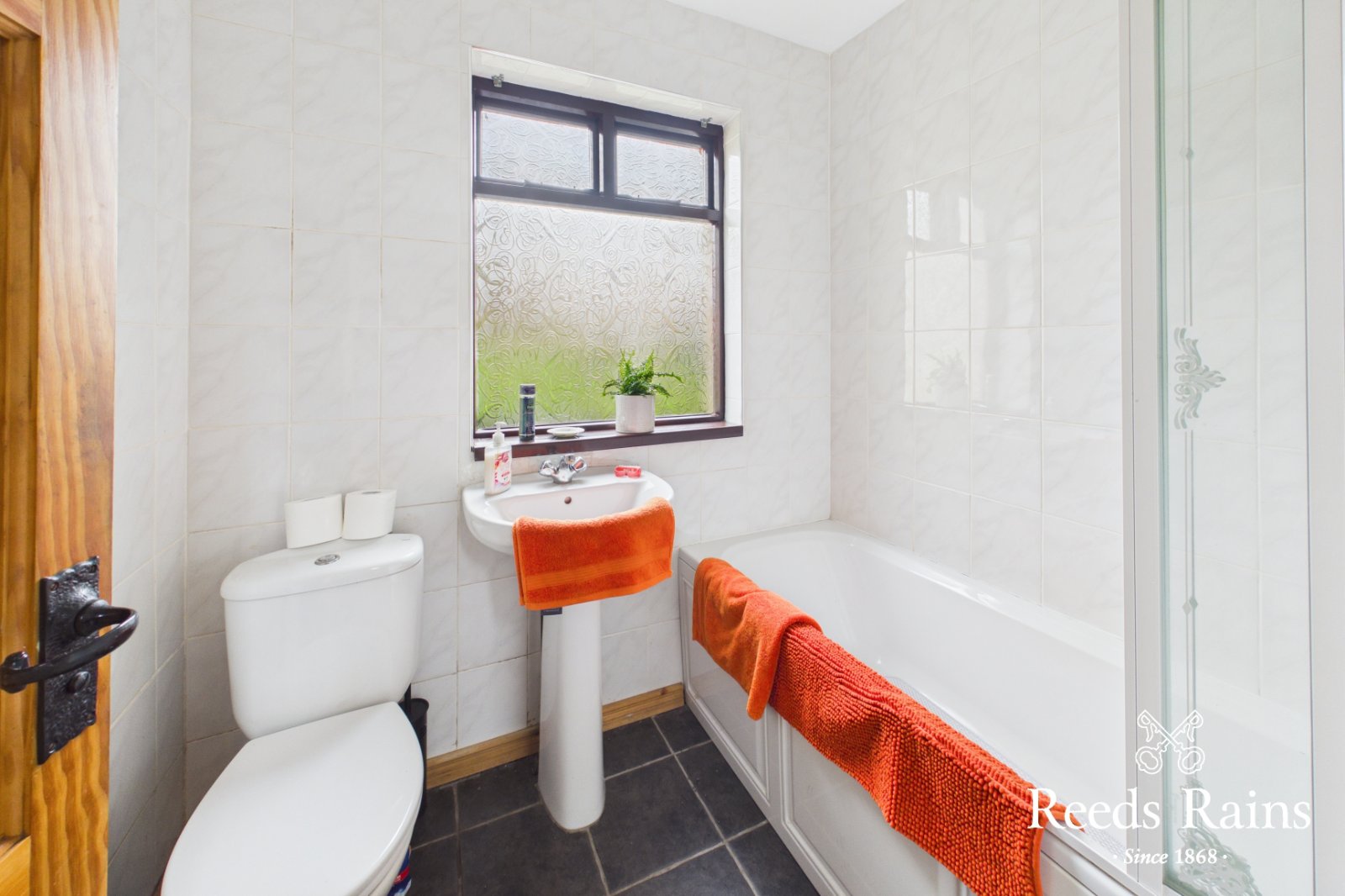 White suite comprising panelled bath, pedestal wash hand basin and low flush wc. Tiled walls and tiled floor.