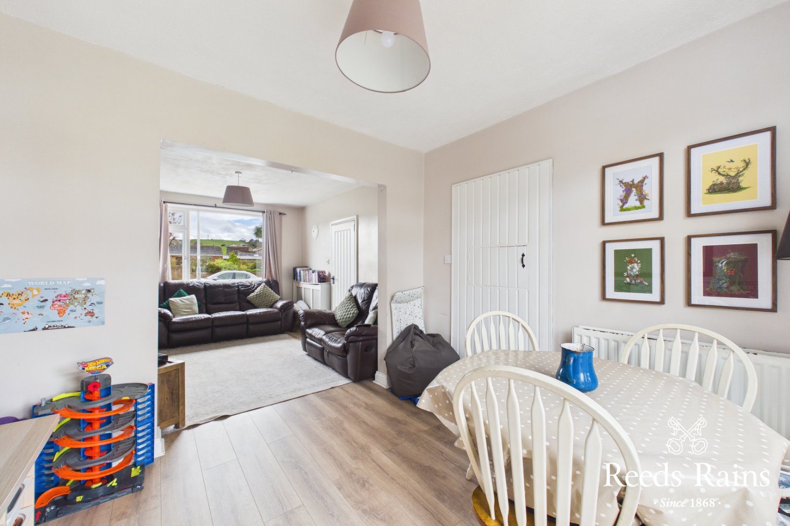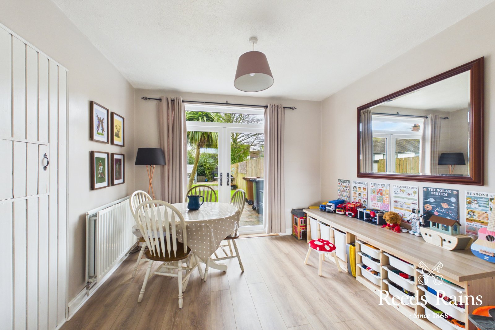 Laminate wooden floor. PVC double glazed French doors to rear garden