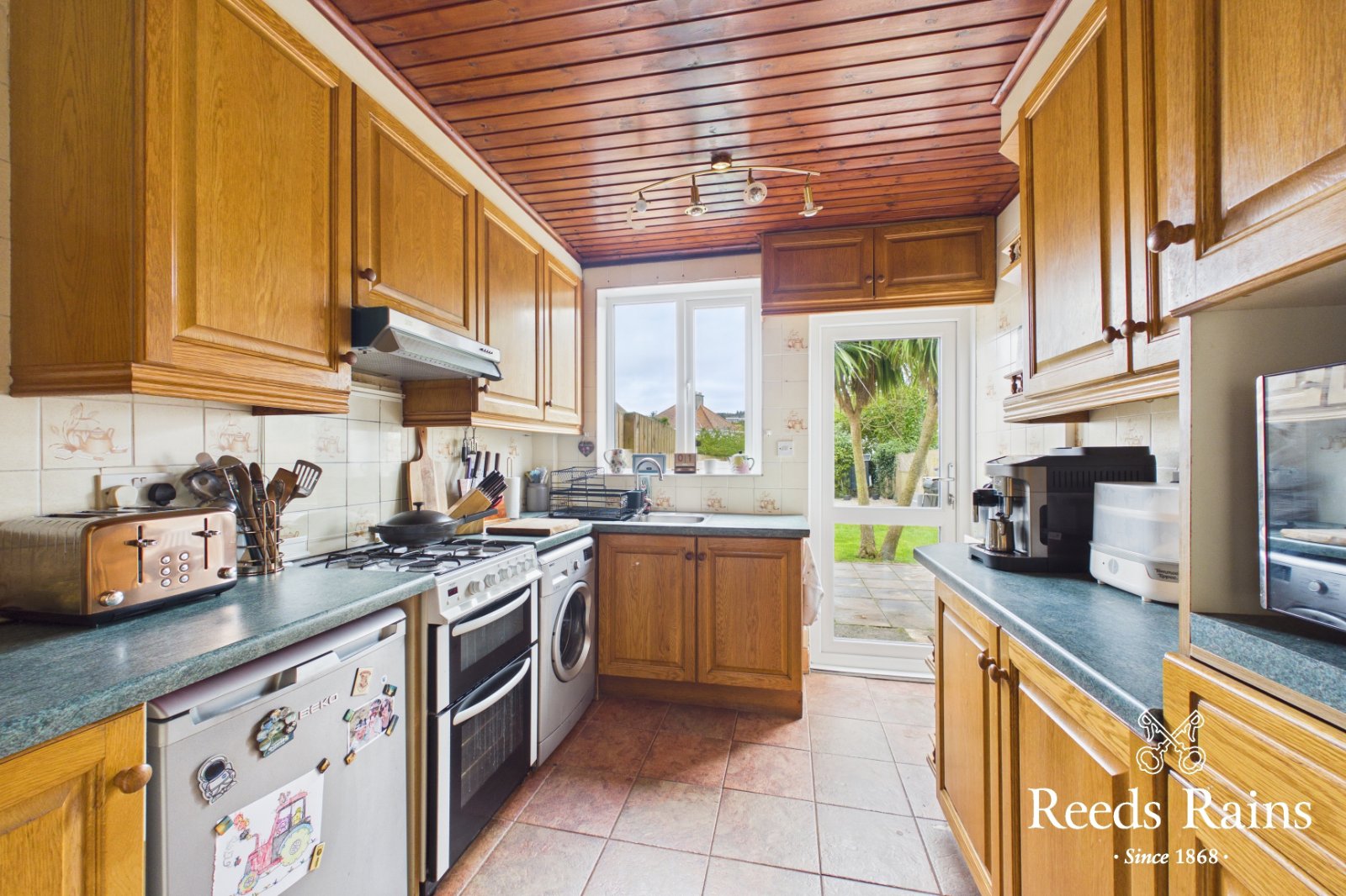 Range of fitted high and low level units. Single drainer stainless steel sink unit with mixer tap. Extractor fan. Part tiled walls and tiled floor. Double glazed door to rear garden.