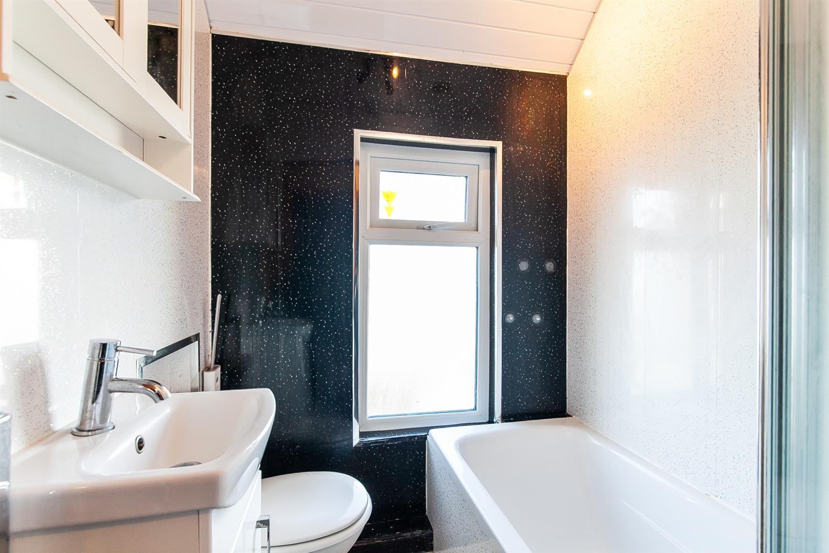 Contemporary, white, three piece suite comprising panelled bath, vanity unit and WC. Electric shower and folding shower screen over bath. Chrome towel radiator. Fully panelled walls. Wood laminate floor covering.