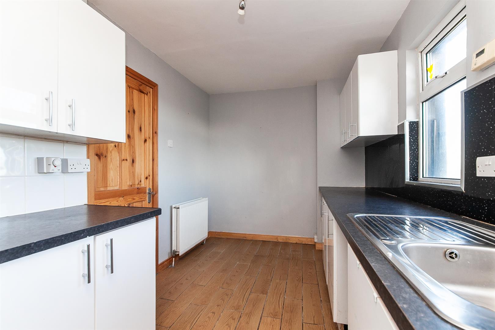 Plumbed and space for washing machine. Melamine work surface. PVC double glazed door to rear garden.