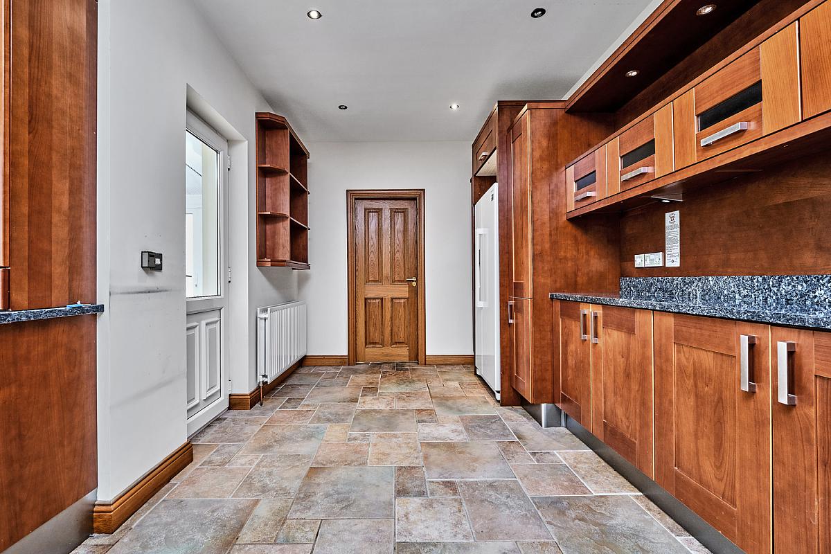 With Pronorm kitchen comprising undermount double stainless steel sink unit set in marble worktops and upstands, high and low level built in Maple units with tiling between, integrated eye level 'Miele' double stainless steel oven and 'Miele' double oven, integrated microwave and 'Miele' coffee machine, 5 ring gas 'Neff' cooker with stainless steel splashback, stainless steel 'Neff' extractor fan above, integrated dishwasher, integrated stand alone cupboard, space for American style fridge freezer, glass display cupboard, shelving and glass display cabinets, wine rack, recessed lighting, drawer bank and saucepan drawers, plate warmer, recessed lighting in pelmets, larder cupboards, over head storage and tiled floor.