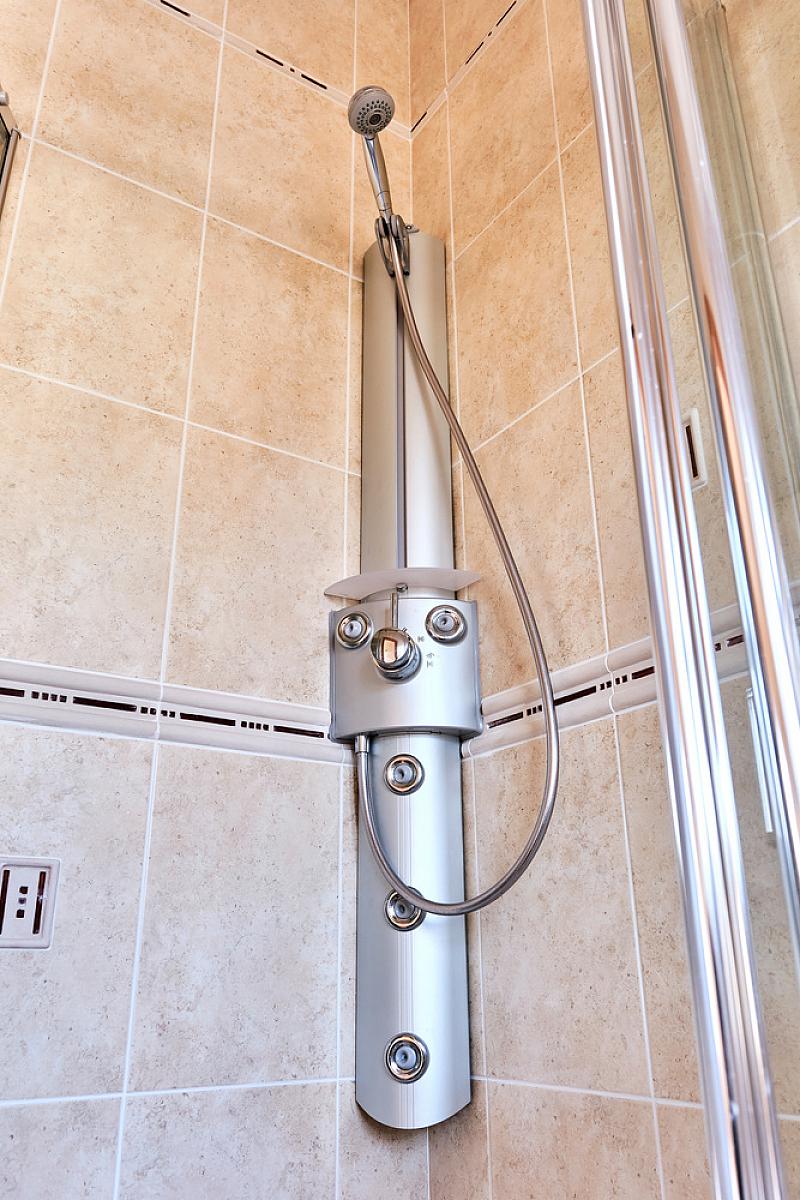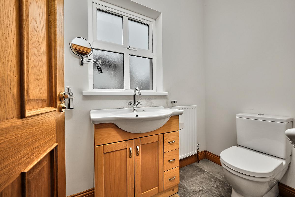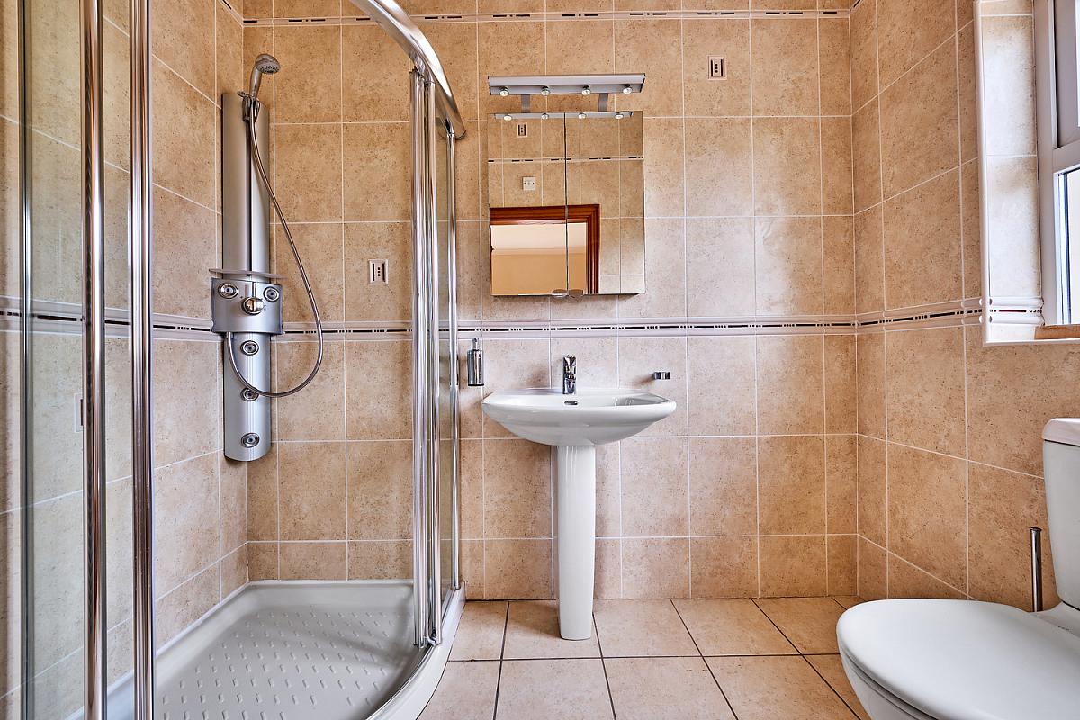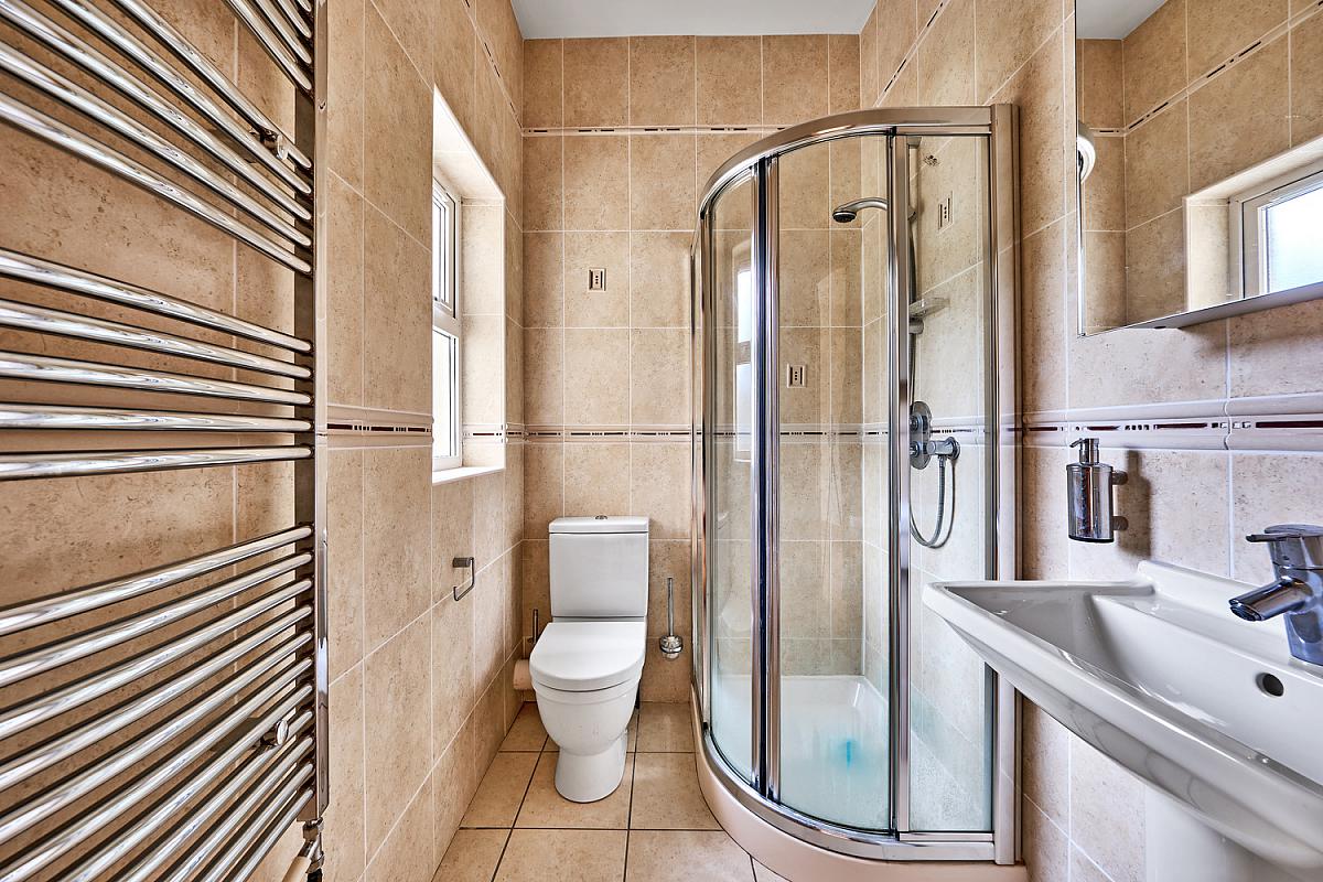 Ensuite off with w.c., wash hand basin, fully tiled walk in corner shower cubicle, chrome heated towel rail, tiled walls and floor.