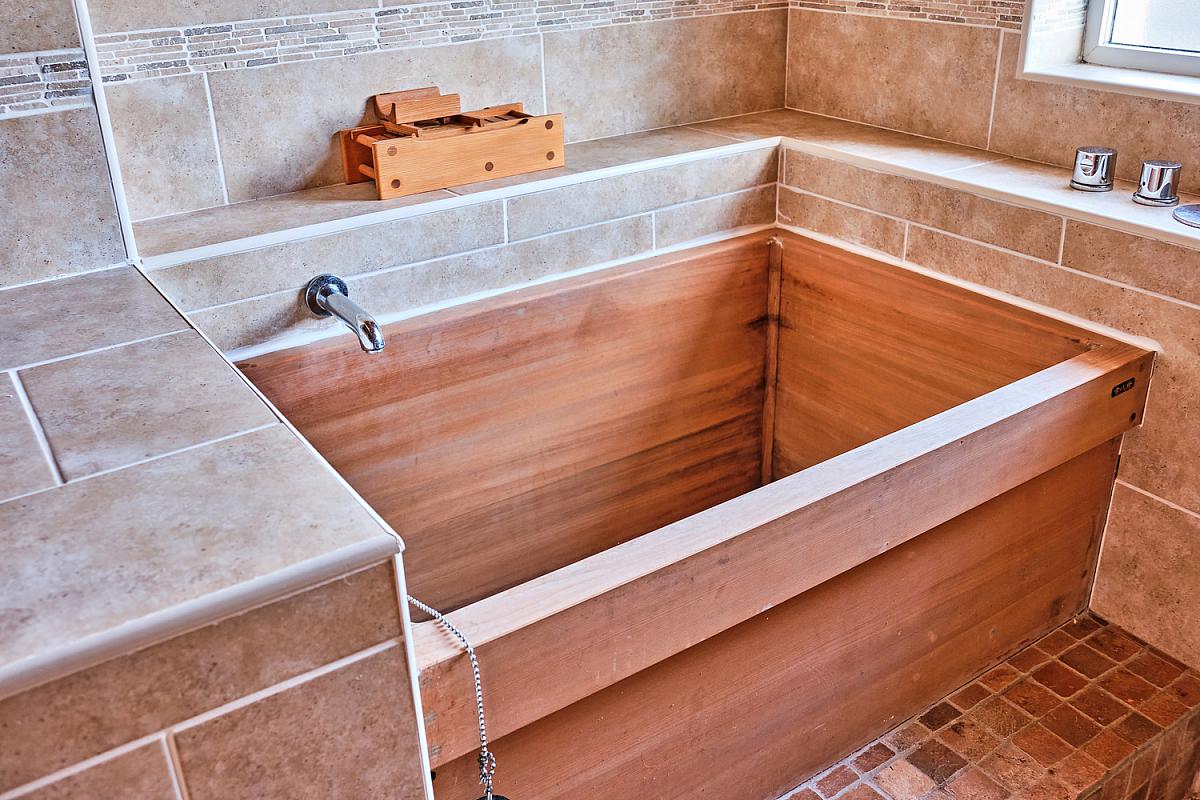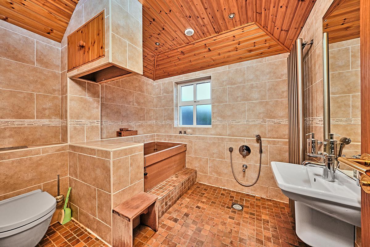 With floating w.c., floating wash hand basin, sunken Japanese bath and wall mounted shower, fully tiled walls, vertical radiator, shelving, tiled floor and pine sheeted ceiling with recessed lighting.