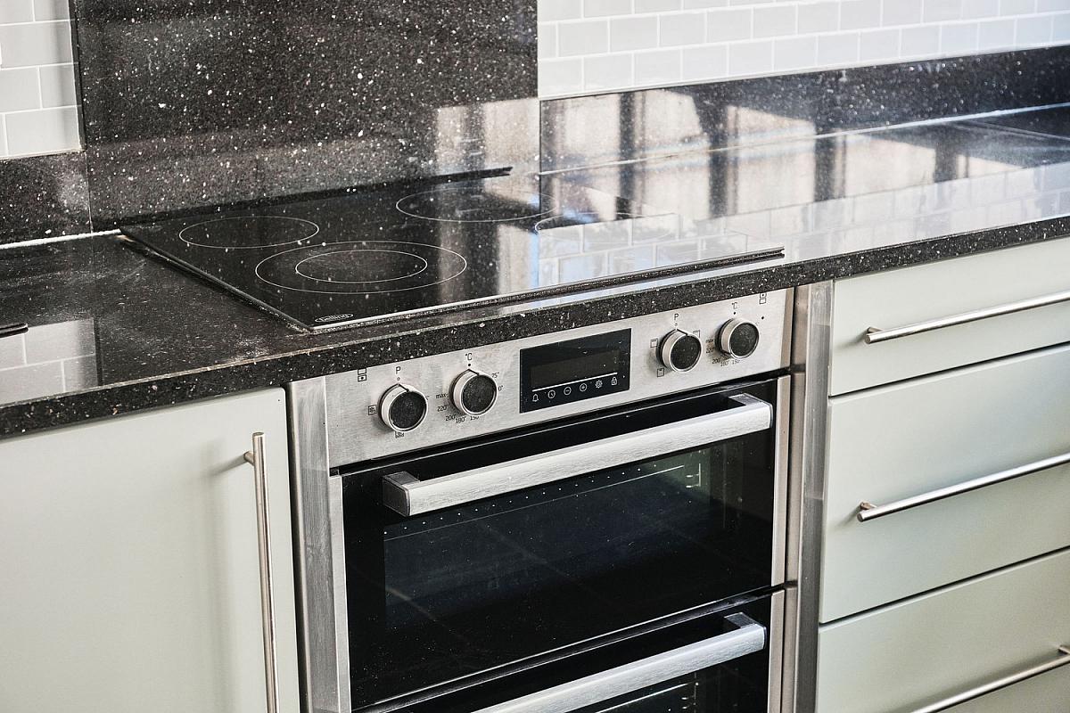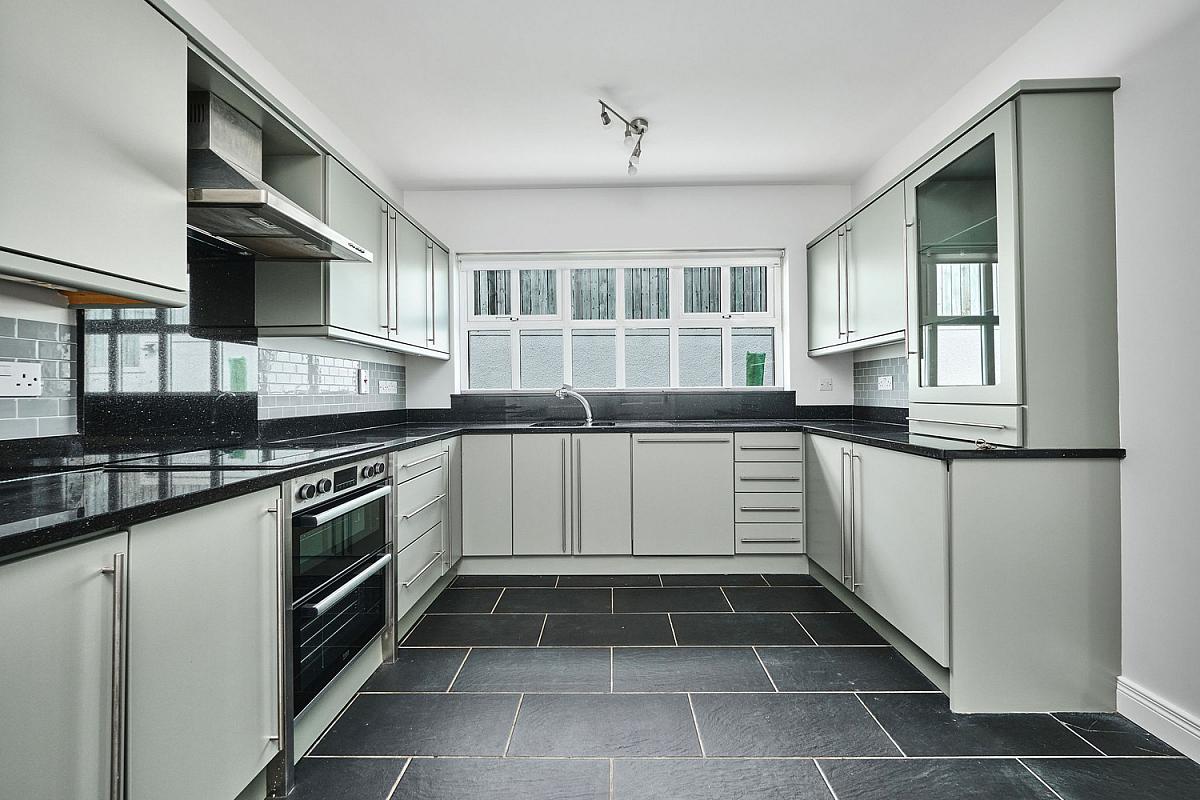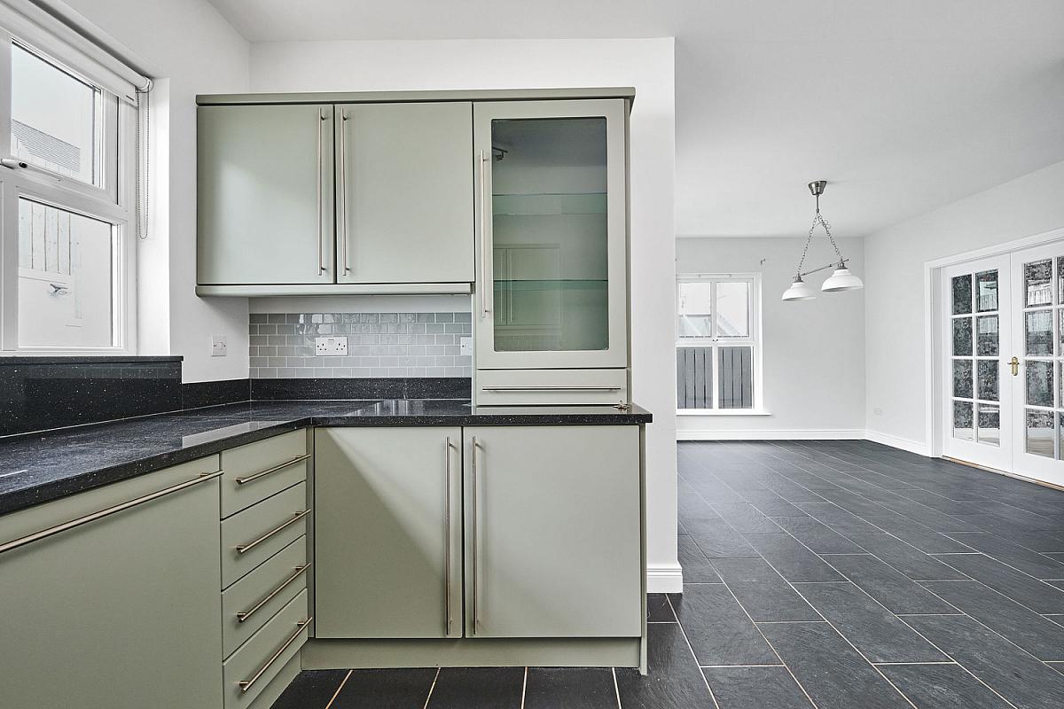 With undermount stainless steel sink unit, high and low level built in units with cream gloss finish and tiling between set in granite worktops and upstands, integrated 'Belling' ceramic hob, 'Beko' double oven, stainless steel extractor fan above, granite splashback, integrated 'Bosch' dishwasher, integrated 'Zanussi' freezer, integrated fridge, drawer bank, glass display cabinet, tiled floor and patio doors leading to rear garden.
