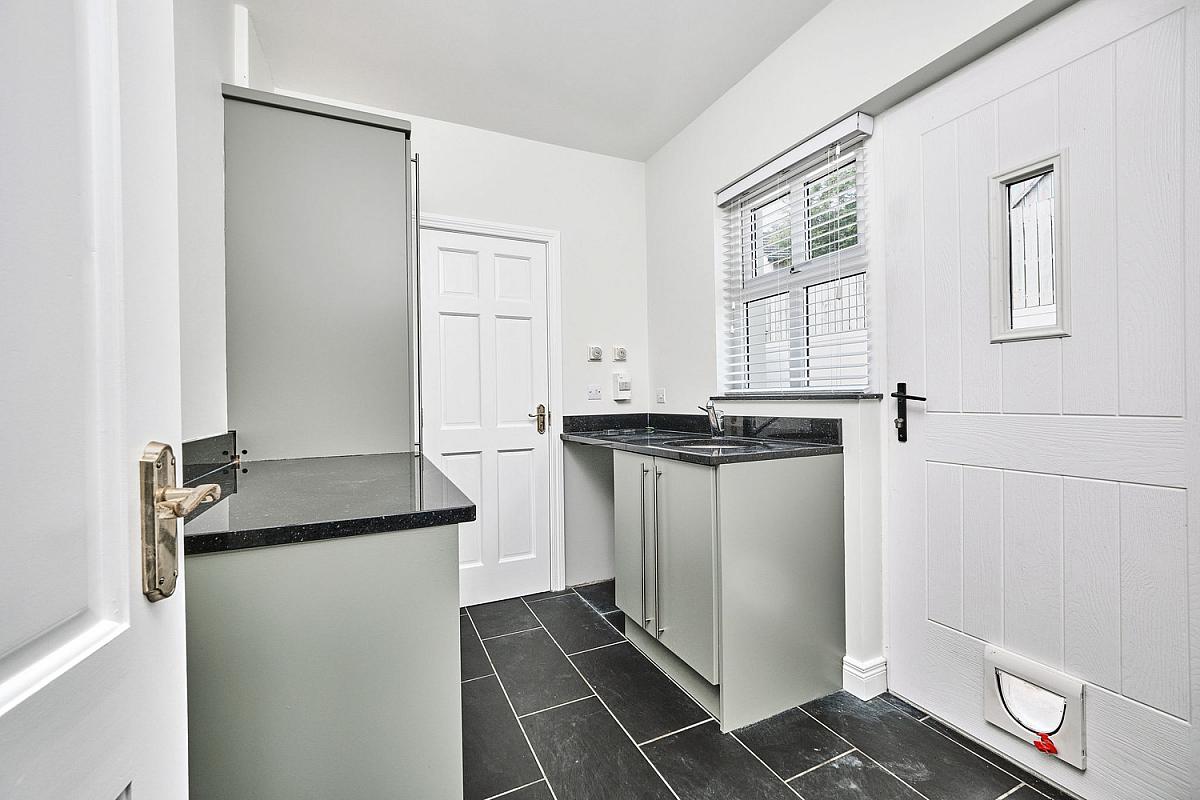 With circular stainless steel sink unit, low level built in units set in granite worktop with upstands, plumbed for automatic washing machine, space for tumble dryer, tiled floor and pedestrian door leading to rear.