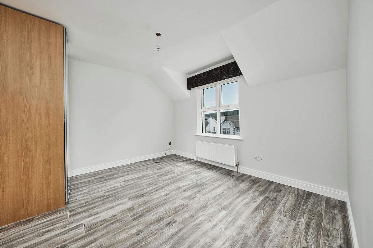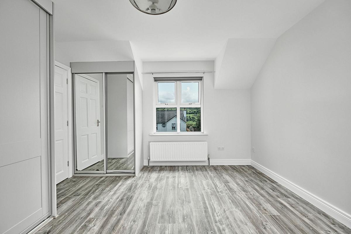 With floor to ceiling fitted wardrobes with part mirrored sliding doors, laminate wood floor and views across Ballycastle Forest and Knocklayde Mountain.