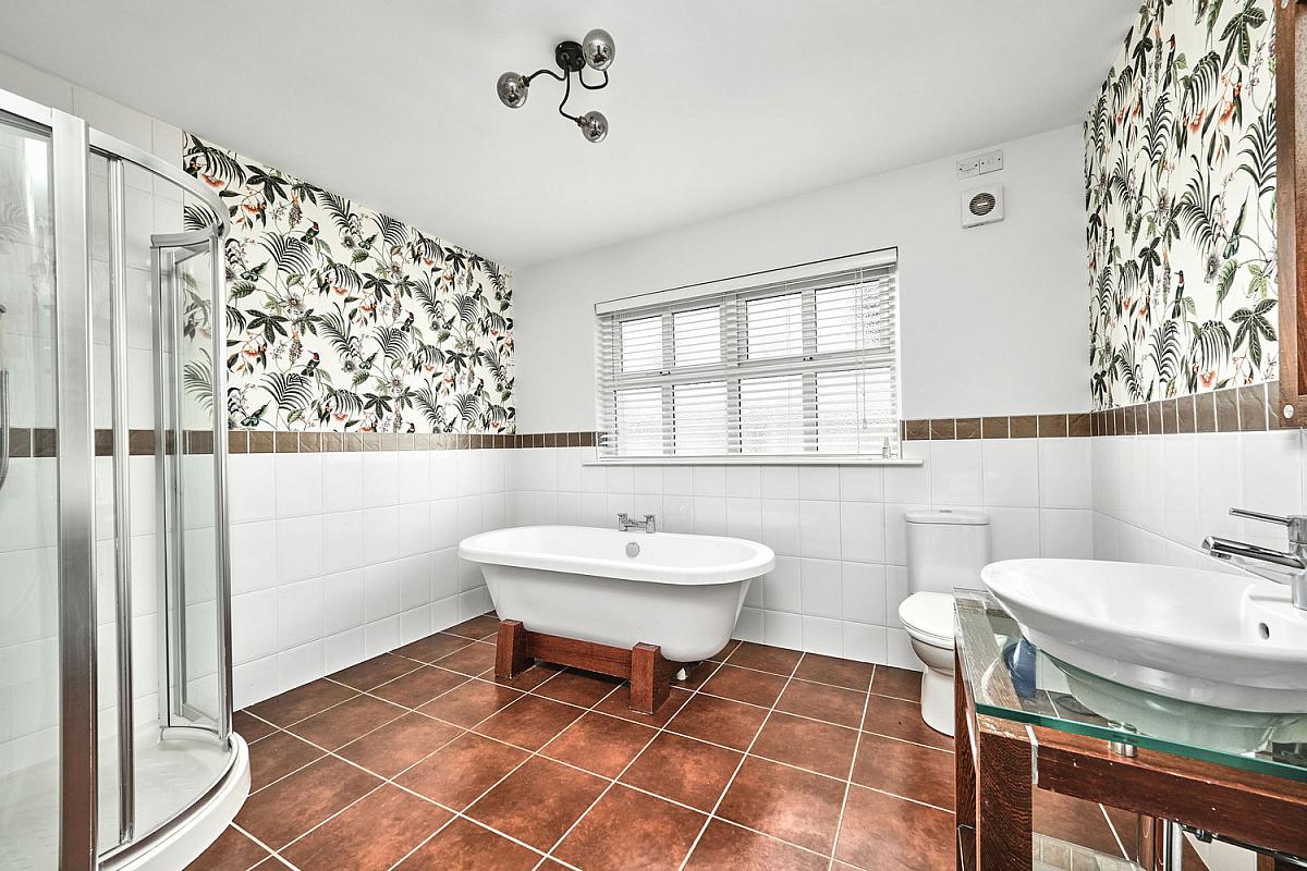With white suite comprising w.c., circular wash hand basin with glass top vanity unit, freestanding bath with mixer taps, fully tiled walk in shower cubicle with Mira Sport shower fitting, part tiled walls and tiled floor.