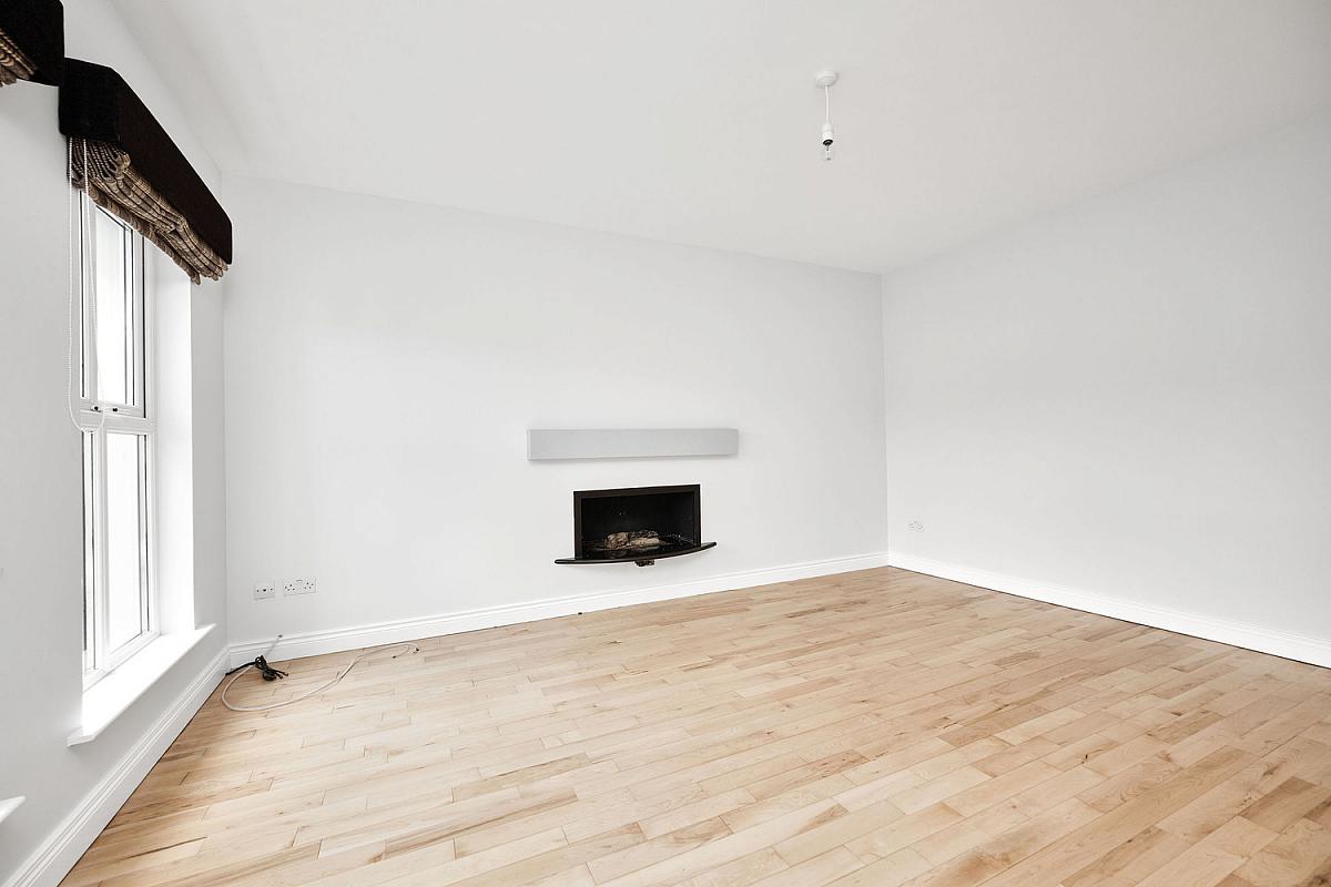 With inset gas fire recessed in granite with wooden beam mantle and laminate wood floor.
